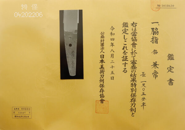 Authentication PaperNBTHK Tokubetsu Hozon Certificate for the blade (No. 1018630)
