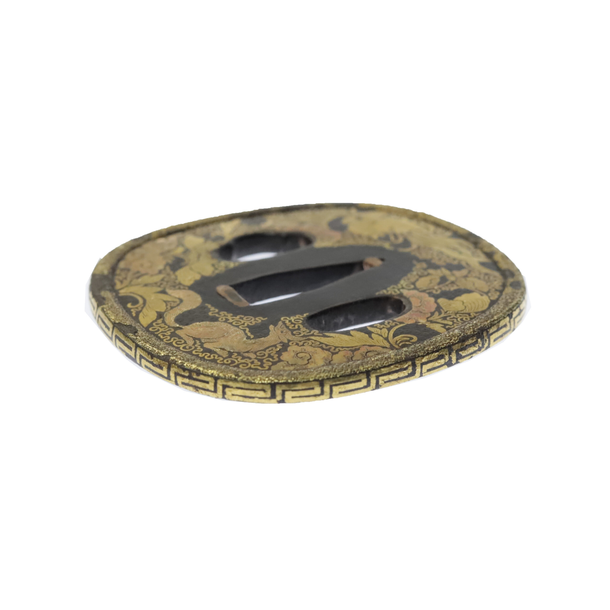 The rim (覆輪, fukurin) of the tsuba is decorated with a geometric thunder pattern (雷紋, raimon), composed of zigzag motifs resembling lightning bolts. This design symbolizes divine energy and protection from evil. In Japanese tradition, lightning represents the raw power of nature and the presence of the gods—qualities admired by samurai as expressions of strength, vitality, and reverence for the natural world.