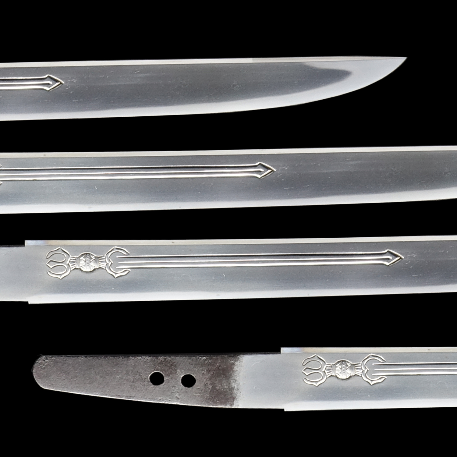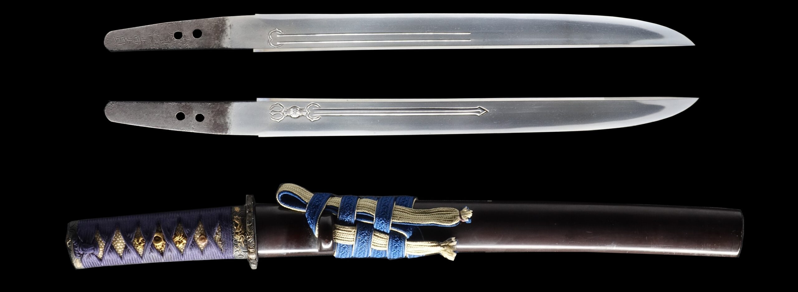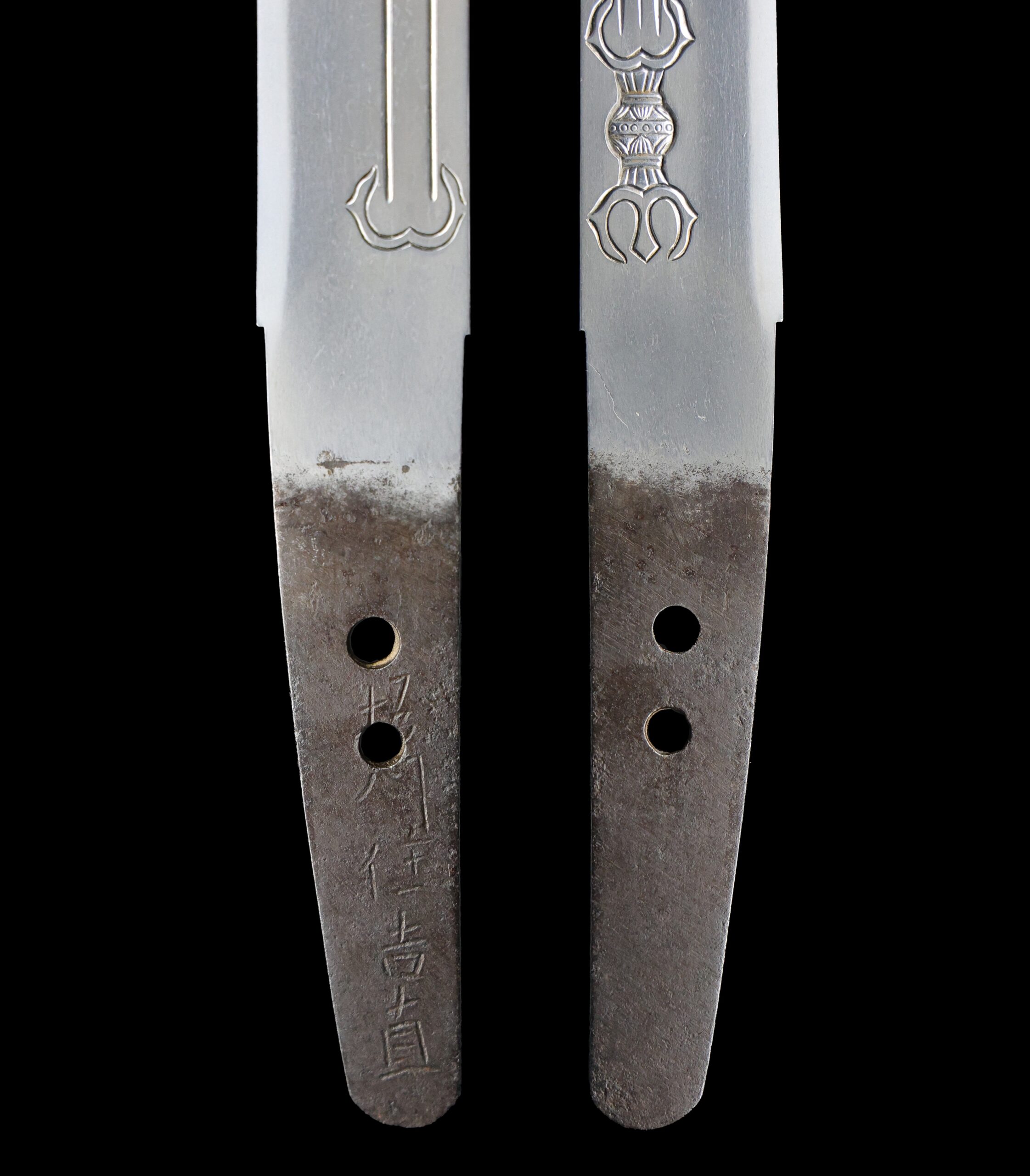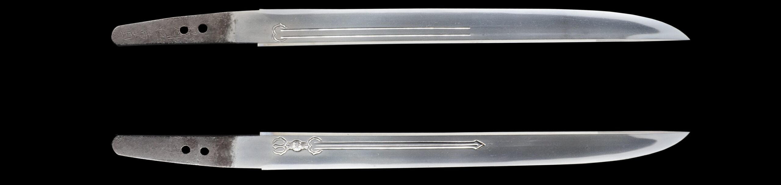 This blade features beautiful engravings on both sides. On one side, you can see a Sankozuka-ken (三鈷柄剣), and on the other, a Suken (素剣).