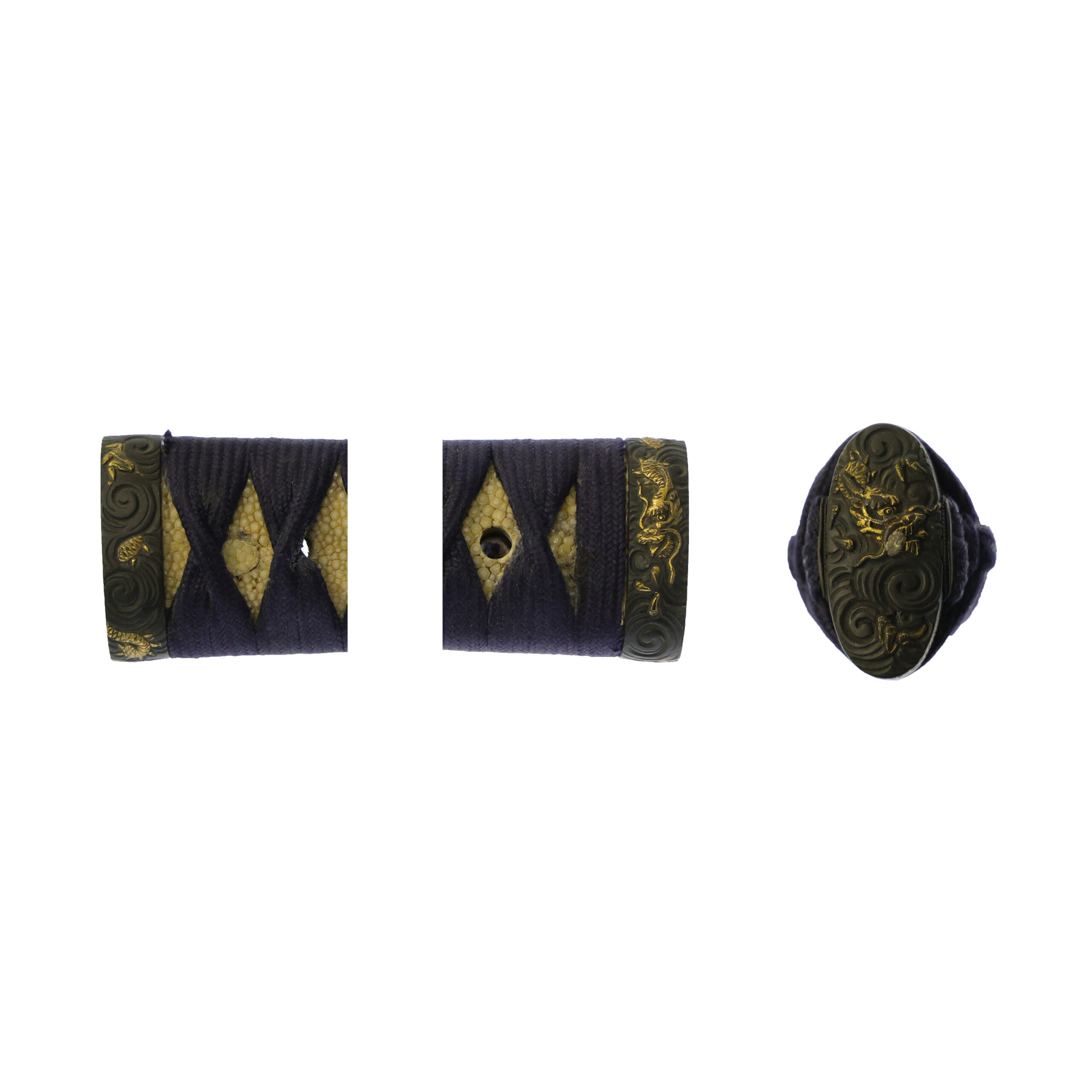 This fuchi-kashira features a dragon motif rendered in gold inlay, matching the menuki, creating a strong sense of unity and coherence in the overall design.