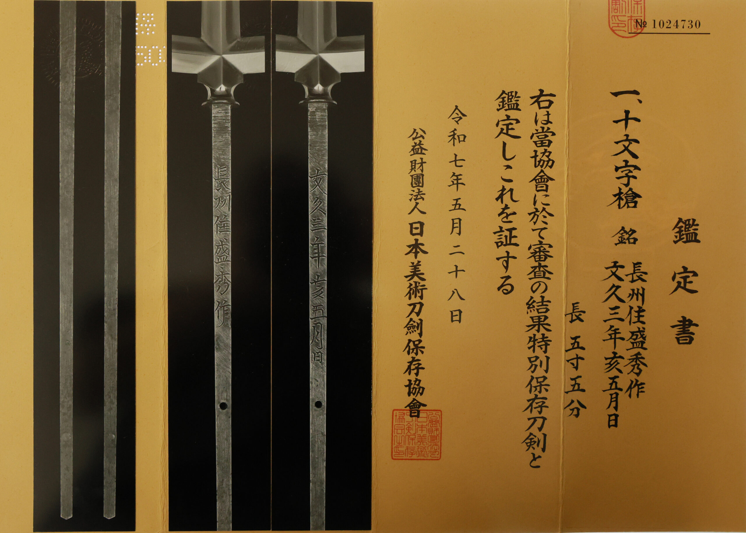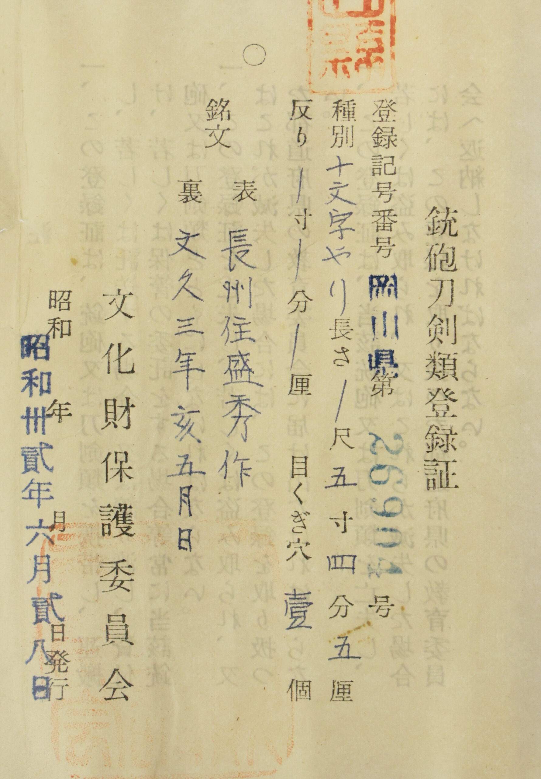 The Board of Education in Okayama prefecture issued a registration paper for this sword . It is called Jyu Token Rui Torokusho(銃刀剣類登録証). Bunkacho(The Agency for Cultural Affairs) acknowledges a Japanese sword with this paper as a work of art.