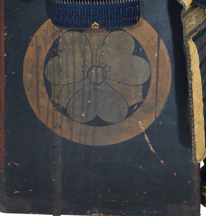 The fukikaeshi of this helmet feature the Ken Katabami-mon (剣片喰紋, “Sword and Wood Sorrel Crest”). This crest depicts three heart-shaped katabami (wood sorrel) leaves arranged in three directions, with three swords radiating outward between them. Although the katabami is an ordinary wild plant commonly found in Japan, it has long been familiar to people’s daily lives and was stylized into decorative motifs early on. Owing to its simple yet charming appearance, it became a popular design used in clothing, furnishings, and architectural ornaments.