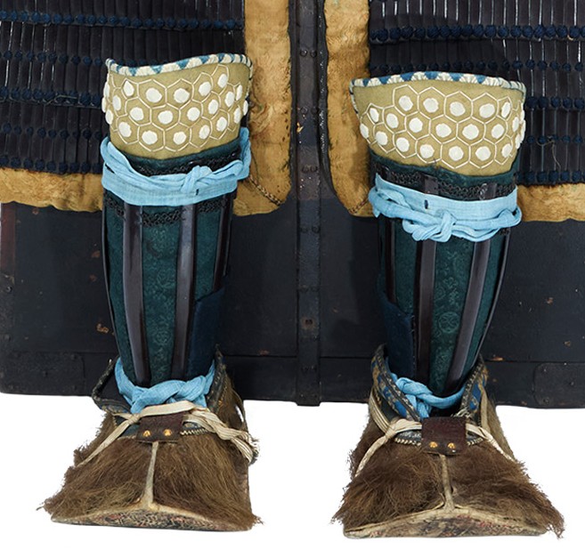 The Kikkou (亀甲, turtle’s shell) pattern is used for the cloth of the Suneate (脛当). It is a continuous geometric pattern connecting regular hexagons up and down. A theory says that this design was brought from China and the Korean Peninsula during the Asuka (飛鳥, 592-710) and Nara (奈良, 710-794) periods. A proverb says turtles live long lives; therefore, turtle and turtle shell patterns represent longevity. In addition, as this continuous hexagonal pattern does not get out of its shape, it is said people wished for eternal prosperity by using this design. This Suneate is a type called Kusari sunete (chain armor shin guard). It features chains attached to fabric, with minimal gaps between the metal links.