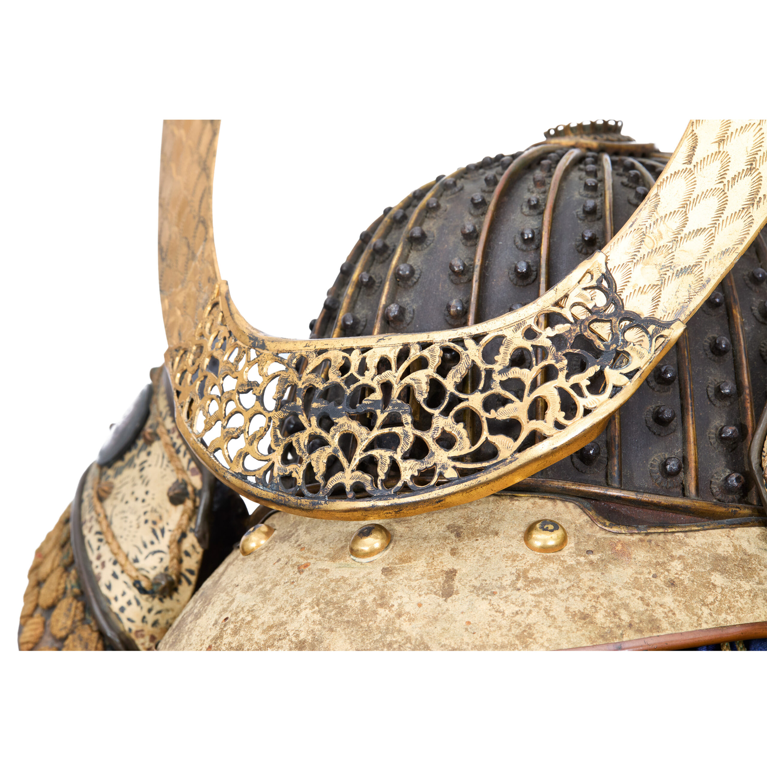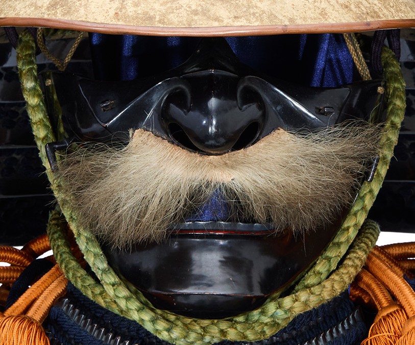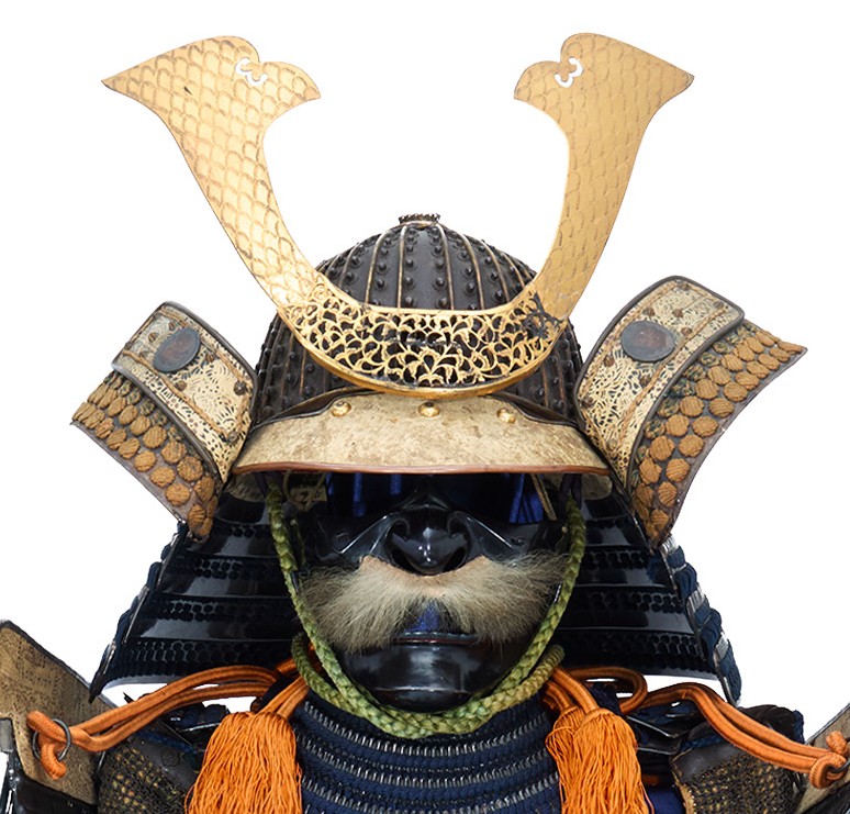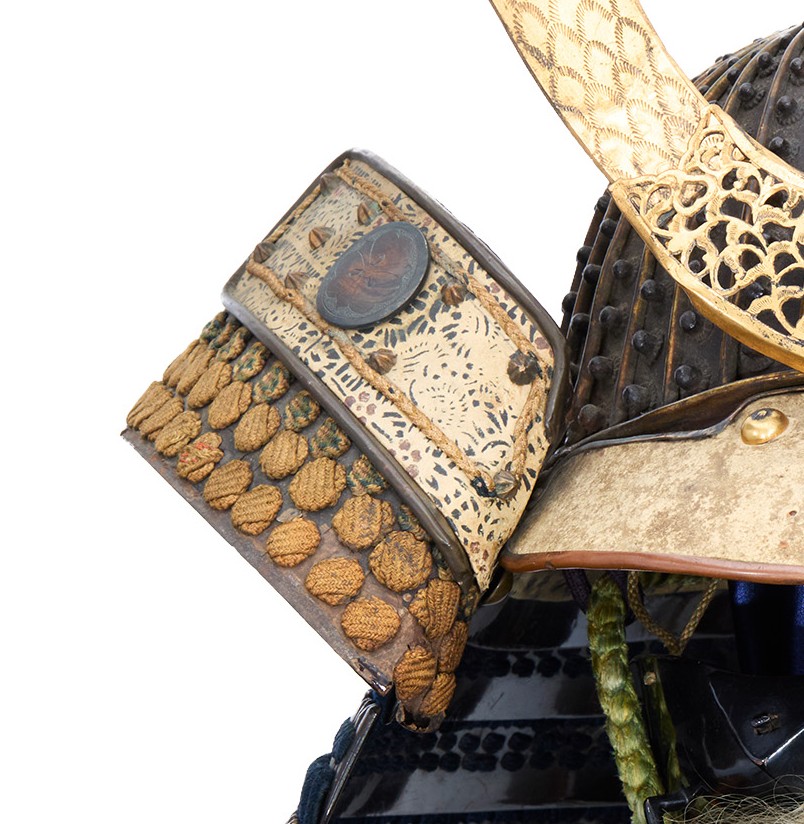 The fukikaeshi are the side flaps attached to both ends of a samurai helmet (kabuto). They served a defensive role by protecting the face from sword strikes, while also functioning as an important decorative element that indicated a warrior’s family, status, and identity.