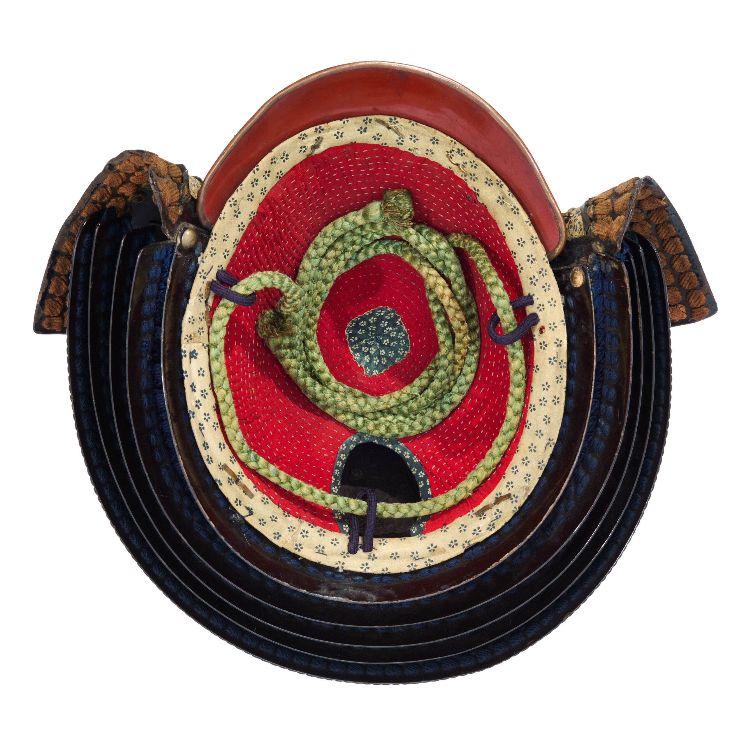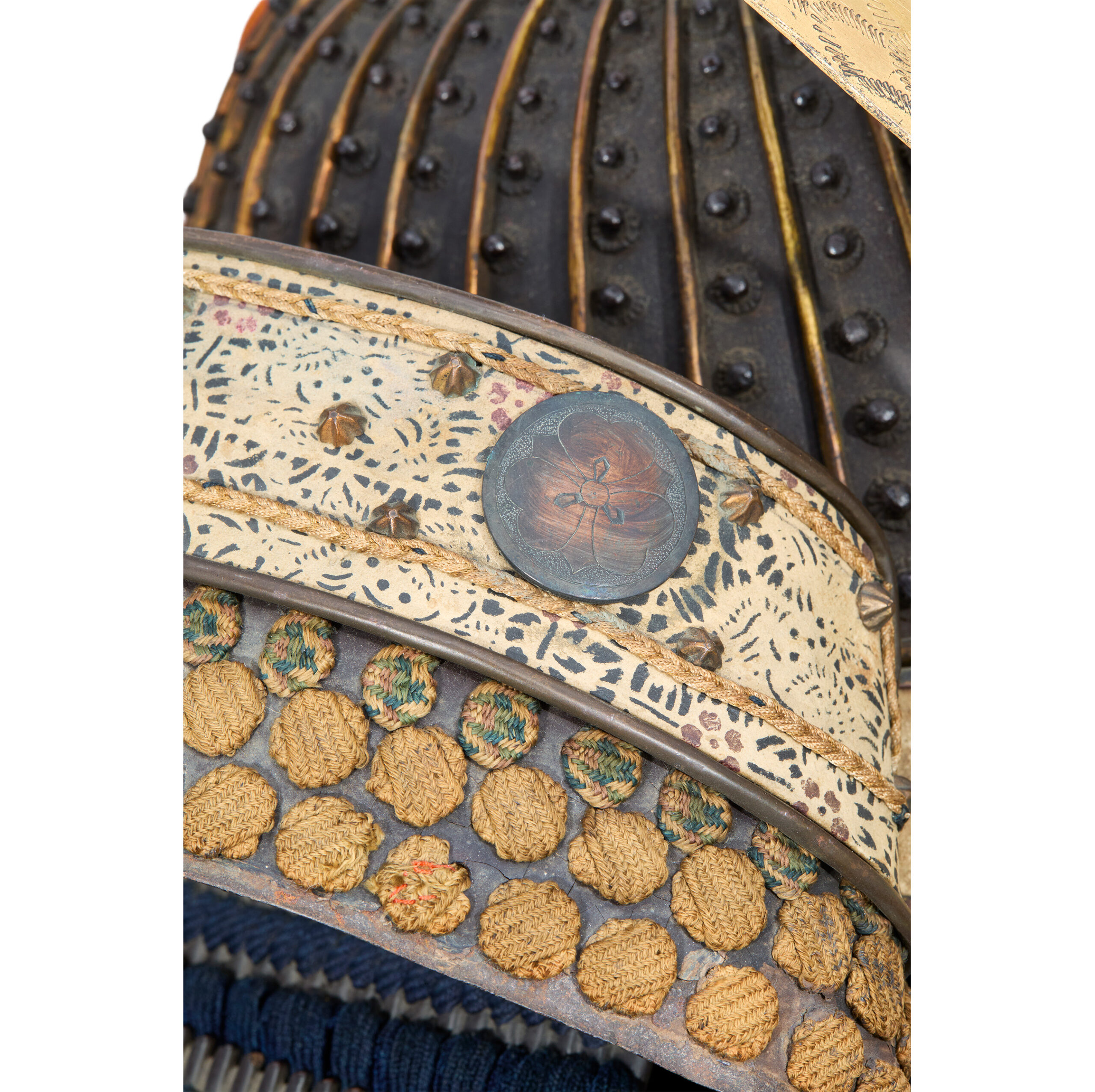 We believe this Kabuto’s style is the Koboshi Kabuto (小星兜), which is categorized as the Hoshi Kabuto (星兜). The Hoshi Kabuto is a type of Samurai helmet that was born in the middle of the Heian period (平安, around 888-1068). Small rivets that hold iron plates together. These rivets are called the Hoshi (星, star). In the Edo period, artisans made Kabutos not only Kawari Kabutos (please check the paragraph below) but also ancient-style Kabutos. For example, in the case of the Hoshi Kabuto, the Hoshis become smaller toward the top of the head; this form is called the Rinotori (厘劣り). It differs from the old-fashioned Hoshi Kabuto, in which all the Hoshis were the same size.