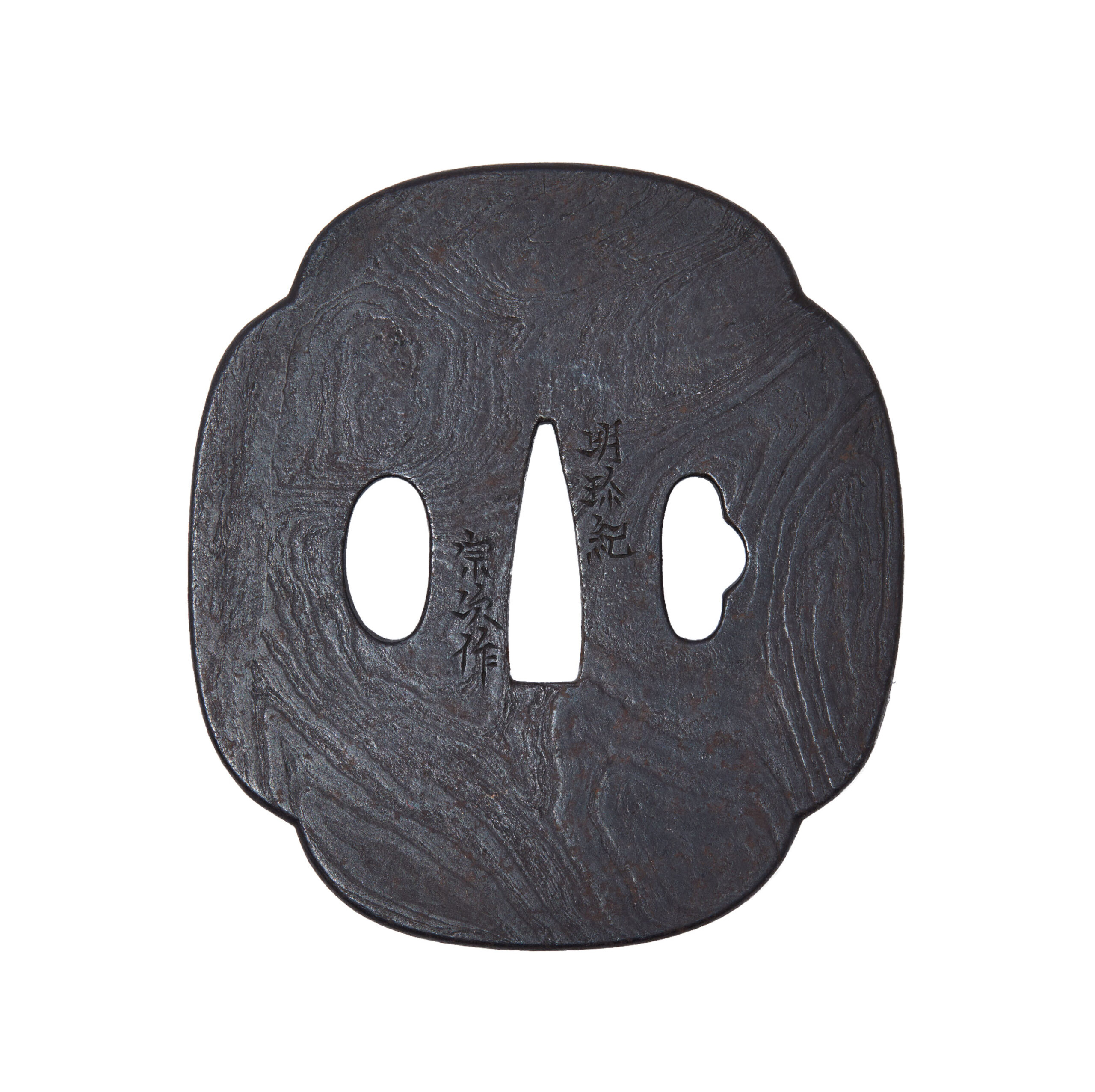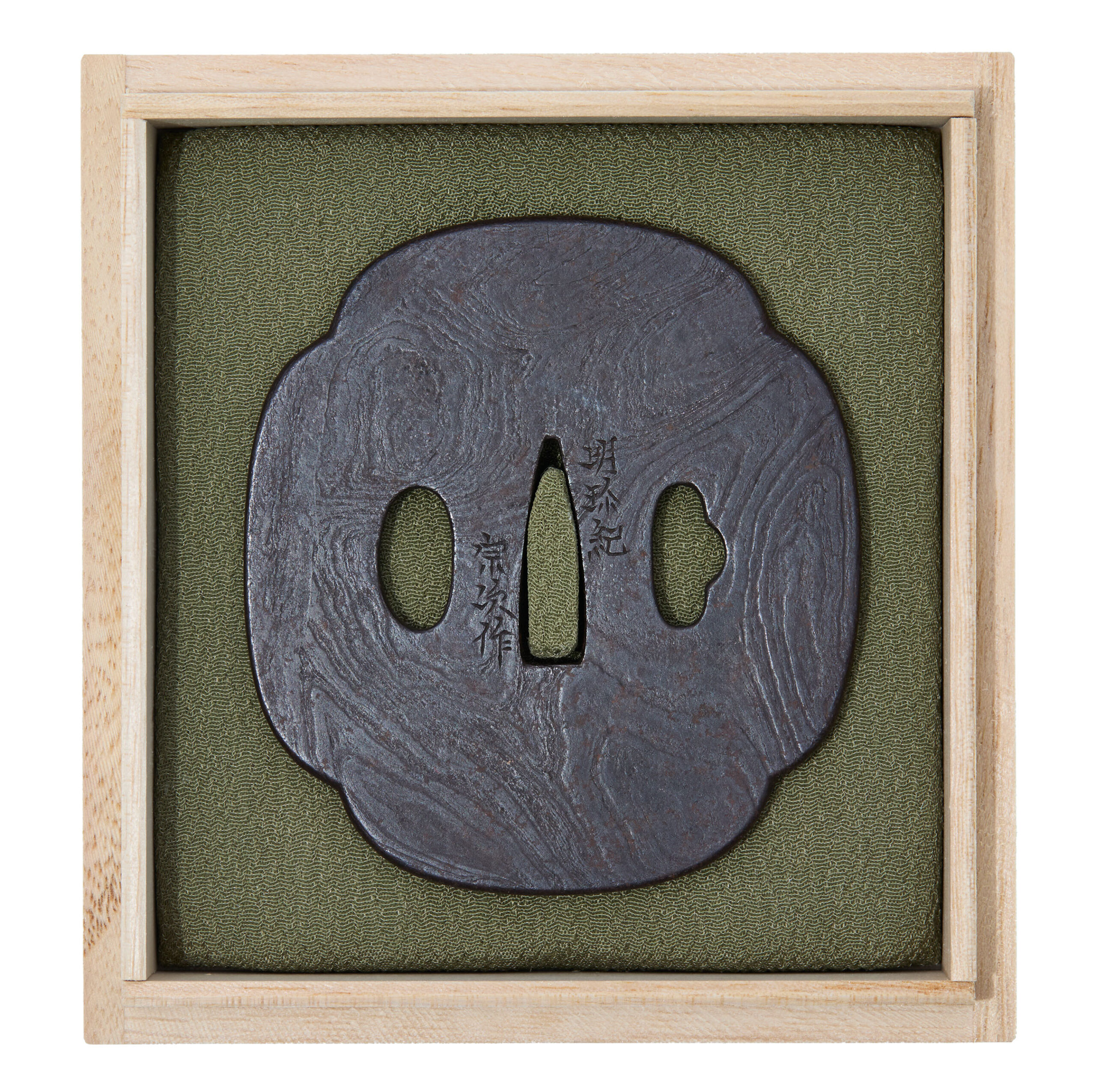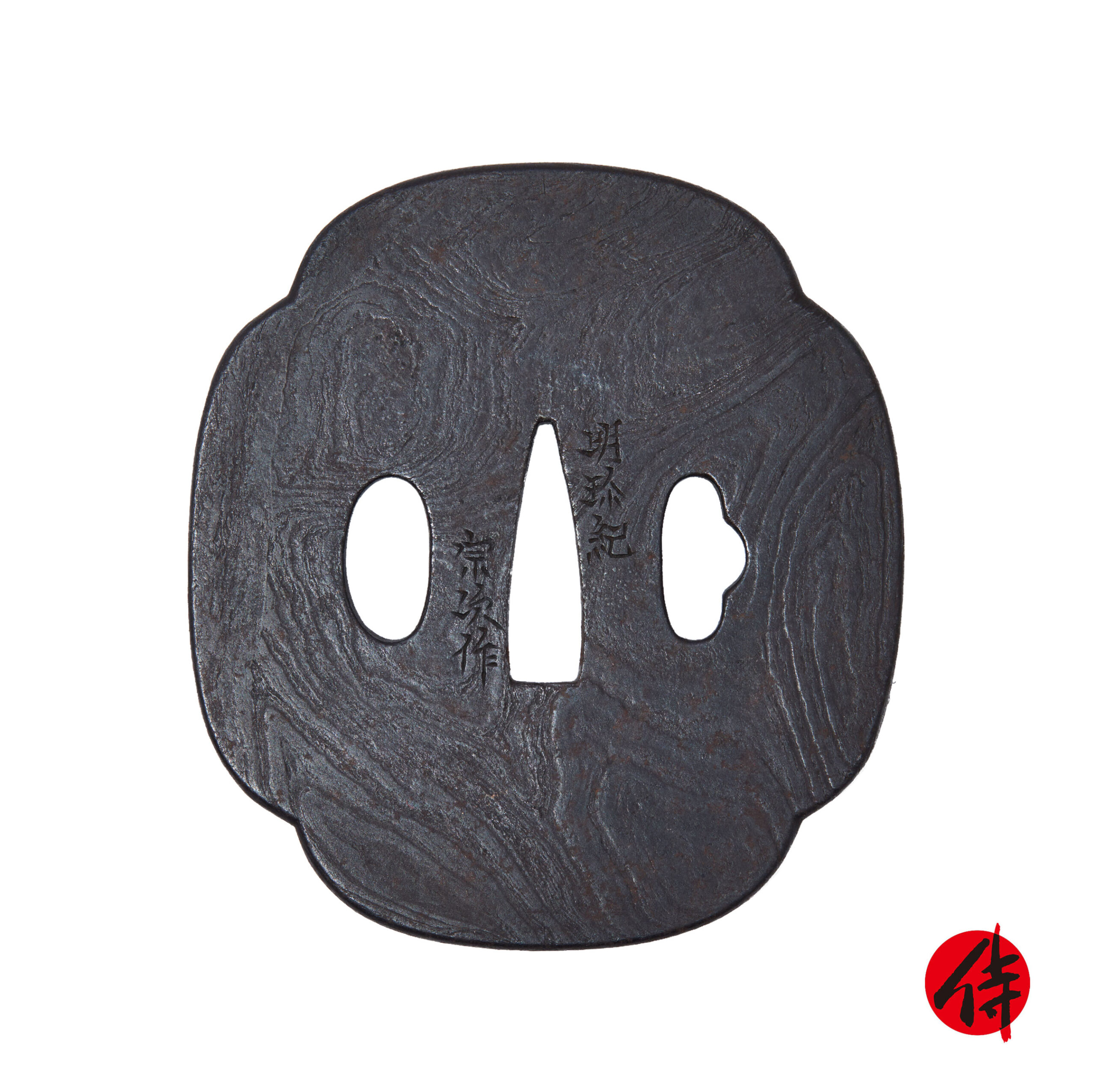 According to the appraisal certificate, this Tsuba was made by Myochin Kino Sōji (明珍紀宗次) and is crafted from iron in a mokko-shaped (木瓜) form.