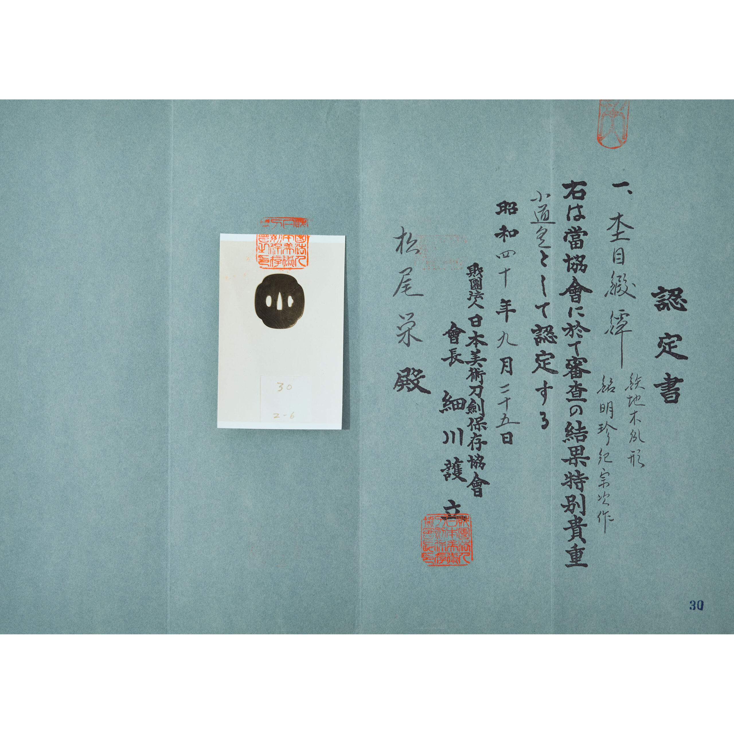 NBTHK, also known as Nihon Bijutsu Touken Hozon Kyokai (the Society for the Preservation of the Japan Art Sword), is one of the oldest Japanese sword appraising organizations in modern-day Japan. They authenticated the Tsuba on September 25th in the 40th year of Showa (1965). They appraised it as Tokubetsu Kichou Kodougu, an old form of the certificate. The purchaser will receive this original certificate as well. We can also translate what is written into English and make a PDF file for your record if you request.