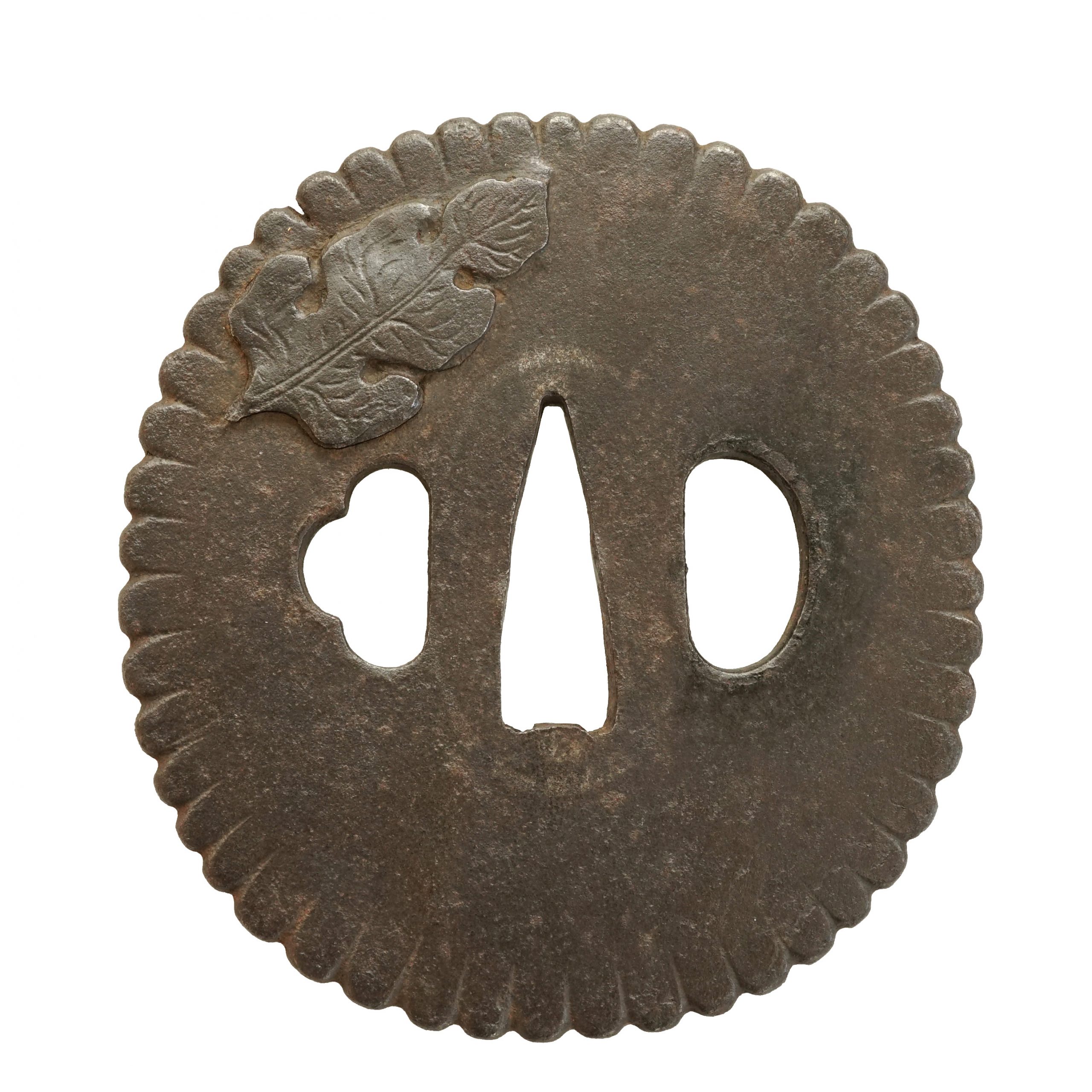 An Iron Tsuba its edge is shaped as chrysanthemum petal. It has Kozuka & Kougai holes. Some chrysanthemum leaves are engraved by the Takabori technique. This flower pattern is called “Kikuka Monyou” in Japanese, which means chrysanthemum flower. It is one of the most popular designs among Japanese people. As its petals form radially, it is linked to the Sun. Chrysanthemum represents eternal youth, longevity, or good health. Many of Saotome Tsuba are chrysanthemum petal form, large and robust style.