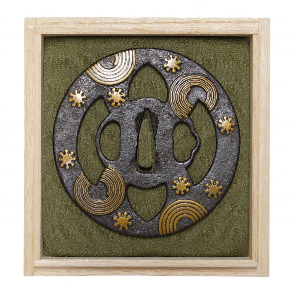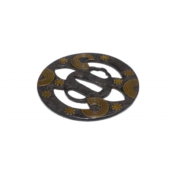 The Yukiwa (雪輪, snow ring) and circle patterns are designed for this Tsuba. The golden metal (probably brass) is applied to these motifs. The shape of snowflakes is the motif of the Yukiwa pattern. It is considered that snow is the sign of a plentiful harvest. Especially if snow in the New Year, people thought that a year would have a bumper crop. According to a theory, the snow crystal pattern itself was born in the Muromachi period (1336-1573), and people started incorporating it as a design of family crests since the Edo period. Date Masamune (伊達 正宗, 1567-1636), who is well-known Samurai and is often called as Dokuganryu (独眼竜, one-eyed dragon). He used several family crests, and one of them has a snow ring motif.