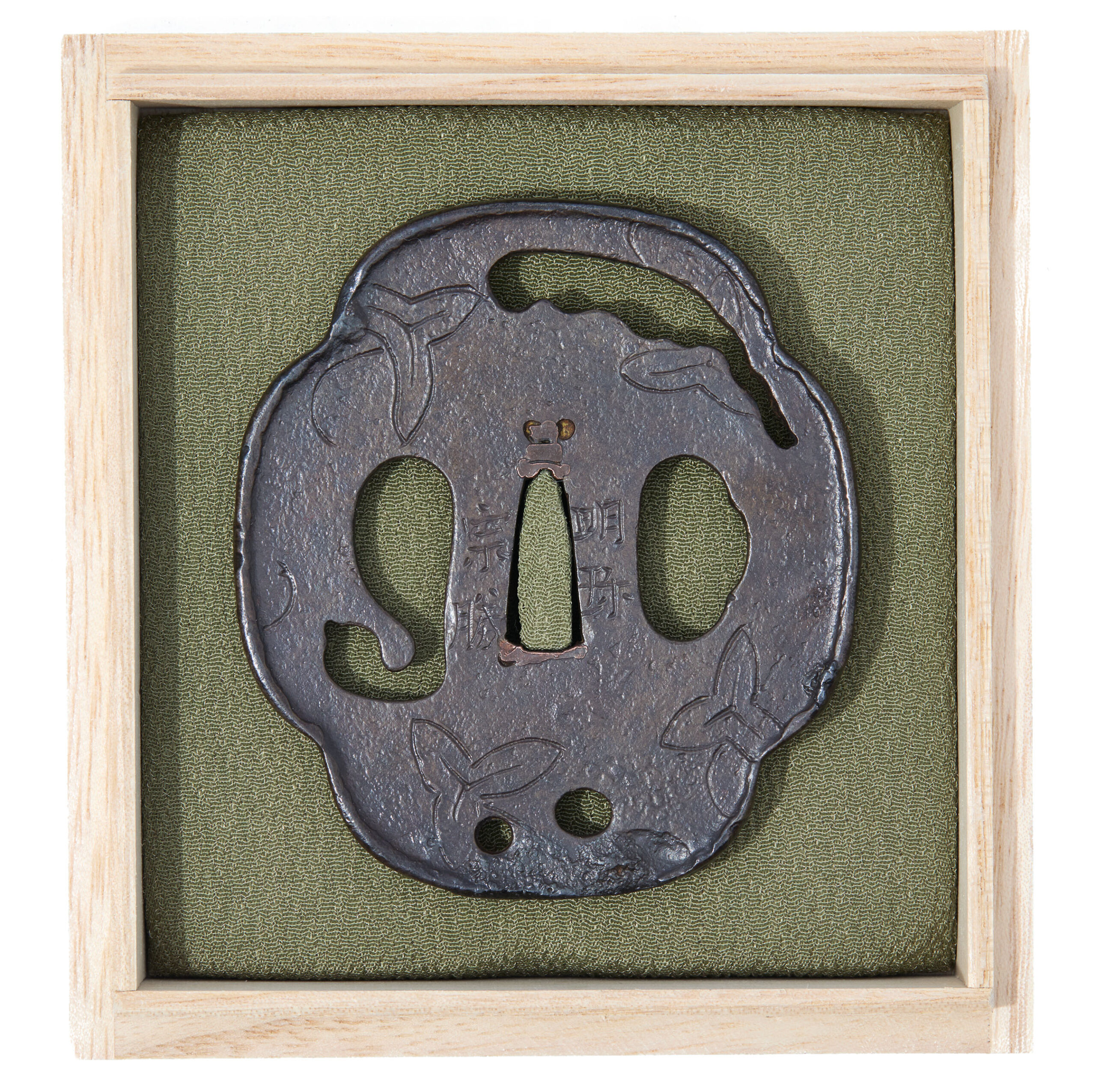 The Makimono is a book that gives us much information; therefore, this motif symbolizes knowledge and wisdom. The Fundou is the symbol of wealth. The Kinnou or Kinchaku is a sachet made of beautiful cloth to hold amulets, money, or spices. It is said that Houju was originally one of the tools of esoteric Buddhism, and it is believed that you could bring out what you want. The Chouji is a spice that was brought from the continent in the Heian period (794-1185). It was used as a fragrance and dye and as a medicinal and clove oil. This Tsuba is full of auspicious designs. We hope that knowing the meaning behind each motif would assist you enjoy viewing this work.