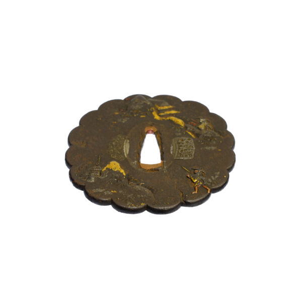 About the design, this Tsuba’s theme is the Sansui Zu (山水図). It is a landscape painting that depicts mountains and watersides. The Sansui theme has existed since the Asuka period (592-710) and has been produced; the Chinese landscape painting styles inspired it. However, this theme became particularly popular after it was brought to Japan from the continent by Sougen (宋元) in the Kamakura period. The natural scenery is elaborately expressed in the Sansui Zu: mountain ranges, towering rocky mountains, flowing down waterfalls, and the gentle curves of the river, for example. Human characters are sometimes described together. Some themes treat a scene from a story, legend, or folklore. On this Tsuba, you would find these motifs. And gold, silver, and copper inlays add decorativeness to this work. Some colorings have already faded due to aging. However, we hope you will enjoy it as an antique texture.