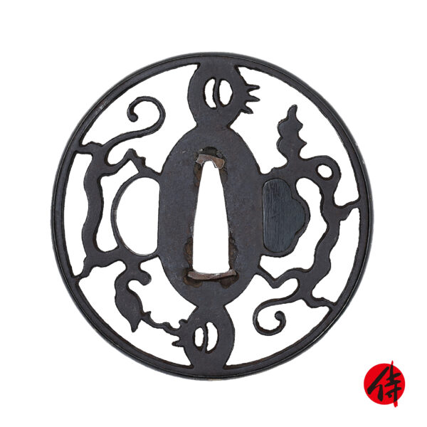 The motifs of this Tsuba’s design would be different based on the viewer. It might be composed of animal patterns, plant patterns, or geometric patterns. As one interpretation, we would like to propose that a highly abstract depiction of two dragons is designed on this Tsuba. Initially, dragons were imaginary creatures found in ancient foreign traditions and myths. Furthermore, it is regarded as a symbolic beast of auspicious signs. Its body is likened to nine animals: antlers are deer, the head is a camel, eyes are demons, the neck is a snake, the belly is the Mizuchi (蛟, a mythical animal in Japan that looks like a snake and has a horn and four legs), scales are fish, claws are falcons, palms are tigers and ears are cows. A dragon was thought to reign at the top of all animals because of its odd appearance. Based on our experiences, there are lots of dragon-designed sword mountings. It shows many Samurai warriors favored this dignified beast motif.