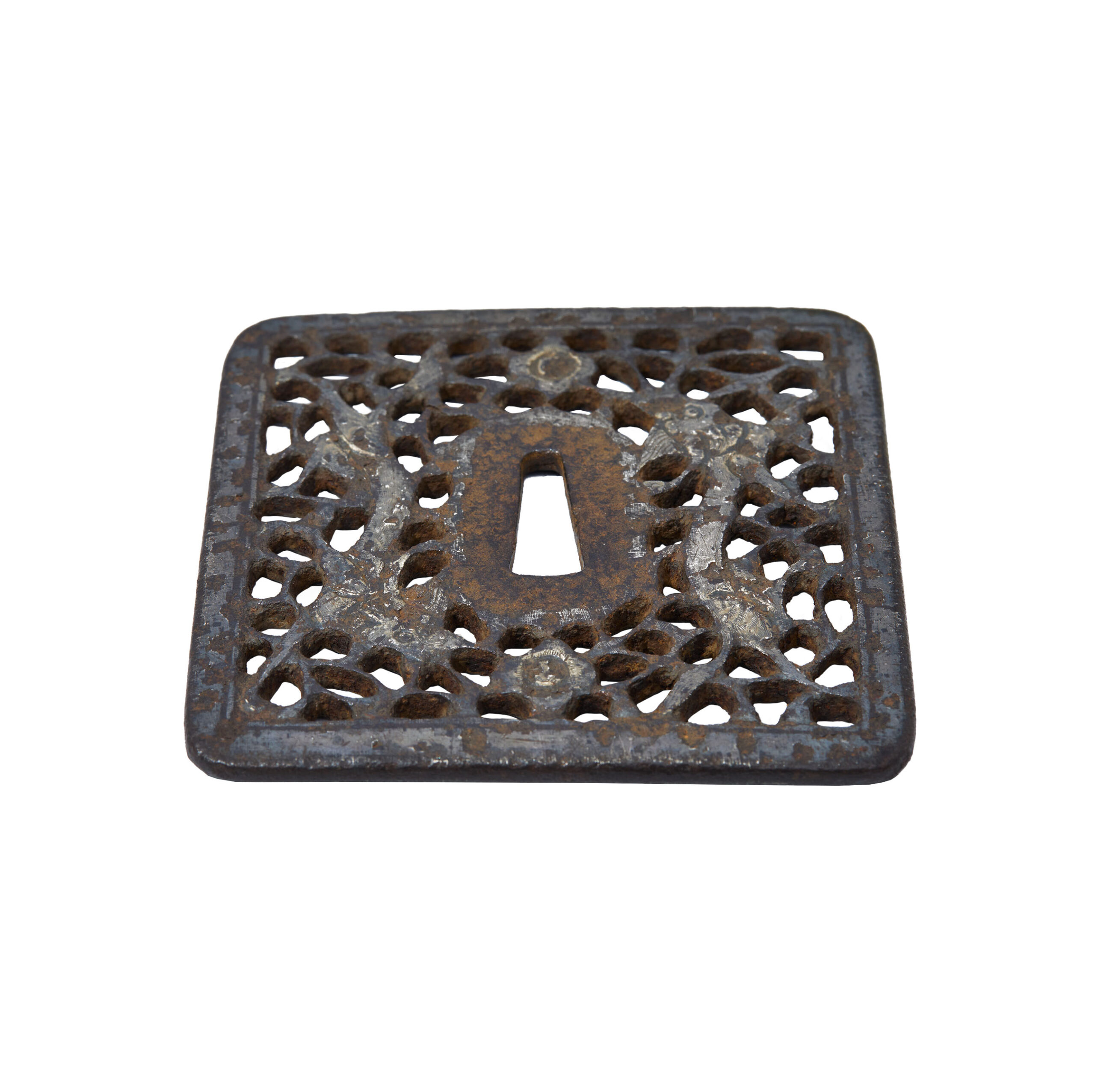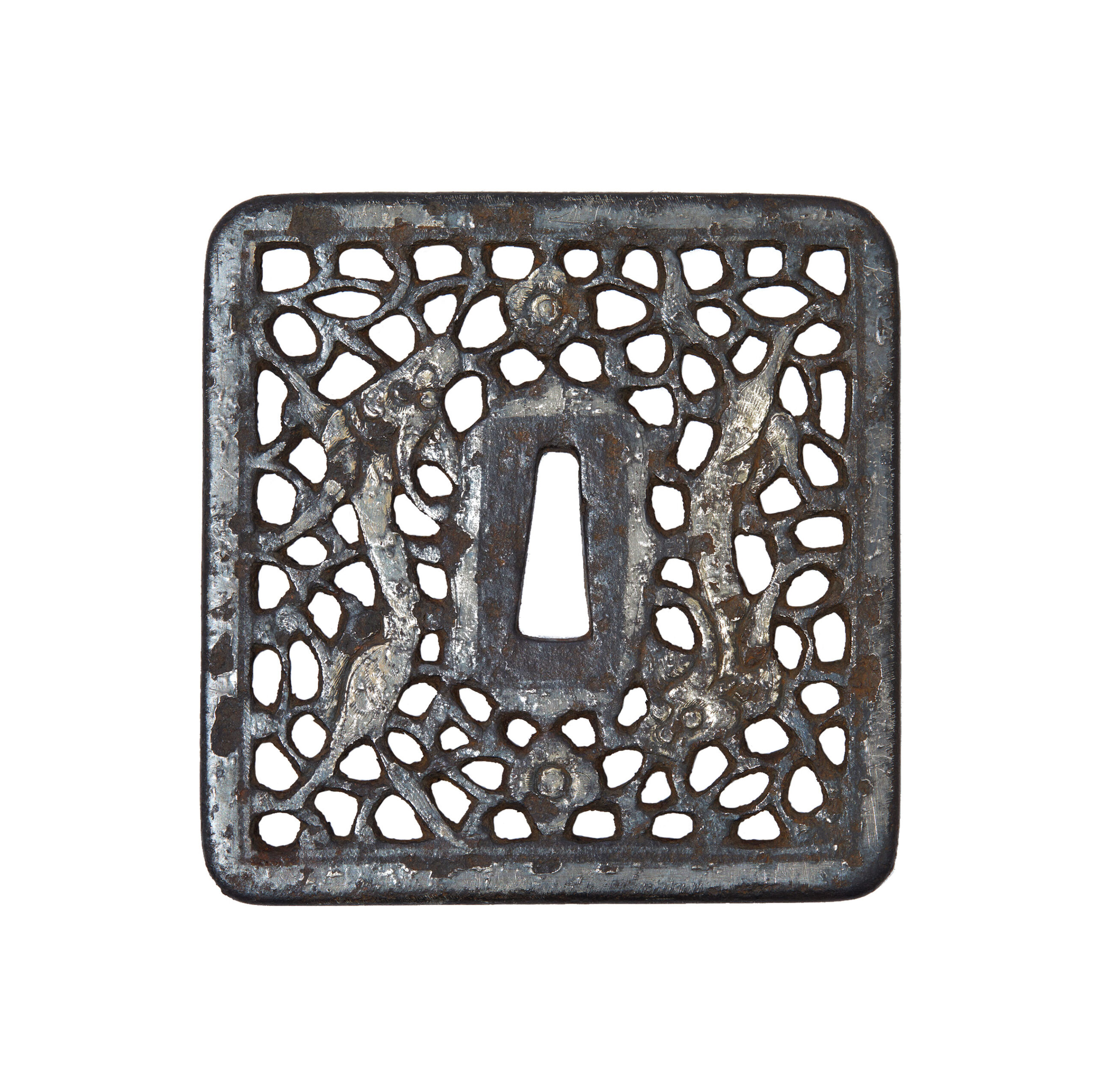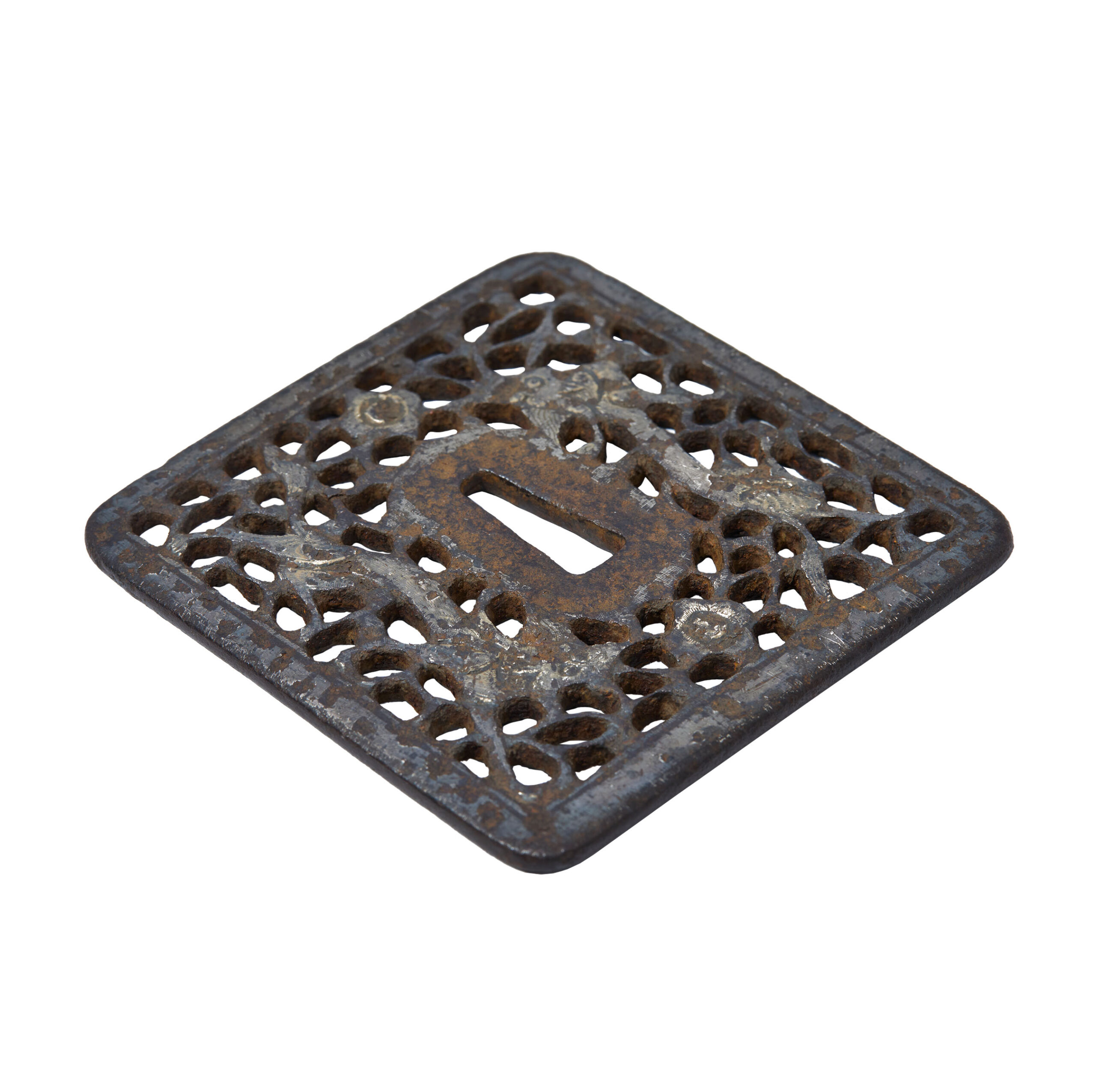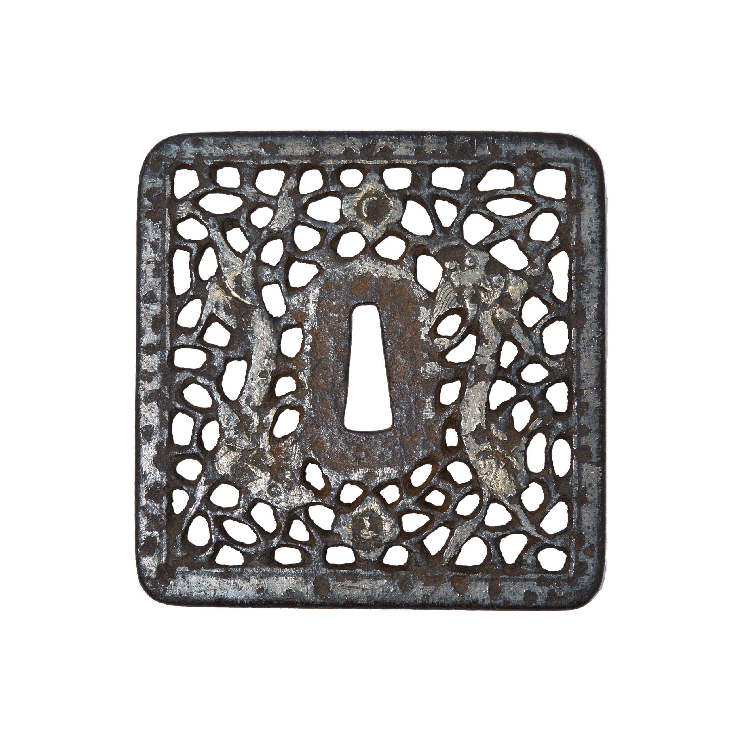In terms of material and technique, this Tsuba is made of iron, has a square shape, and features highly detailed openwork.