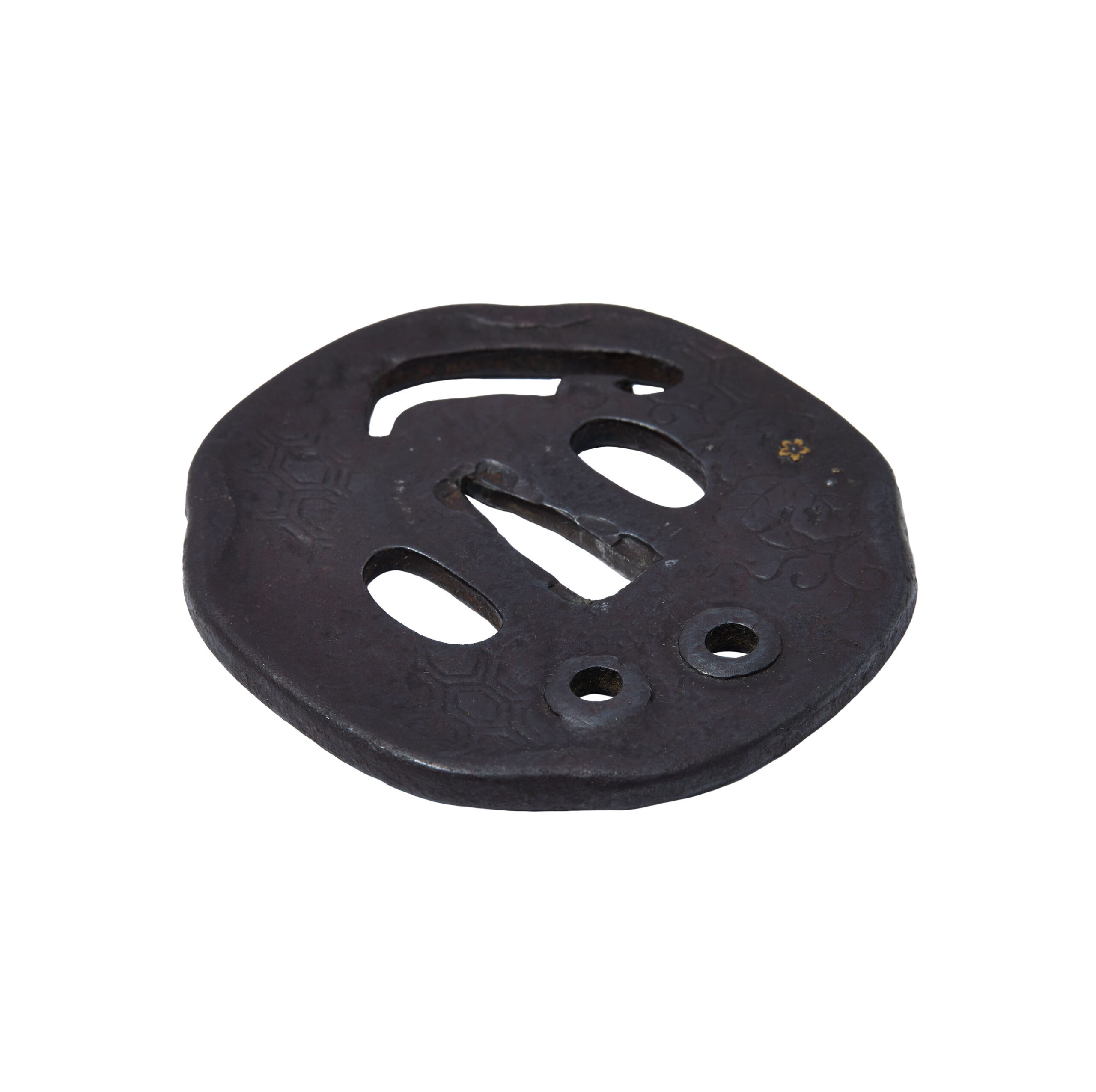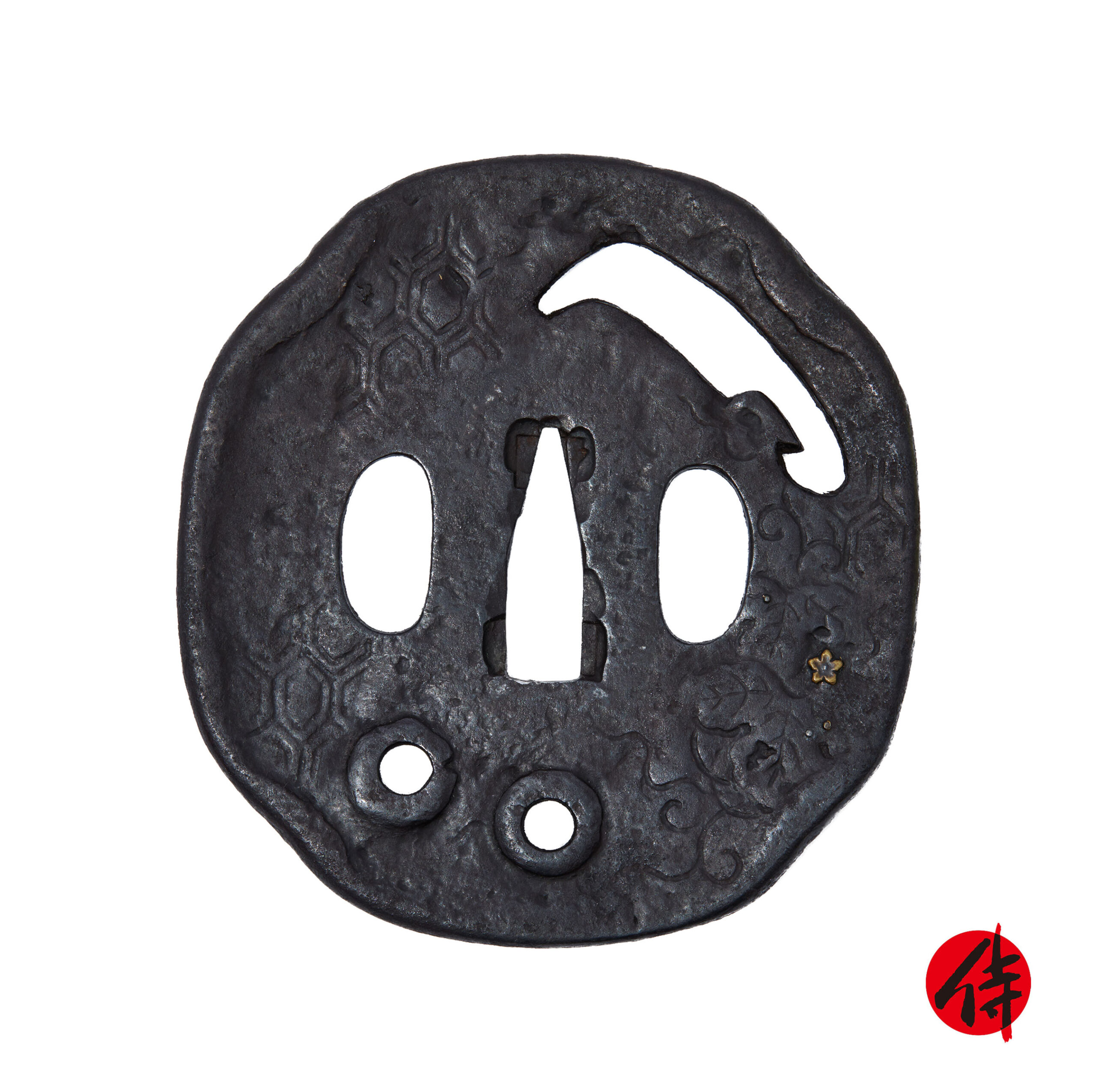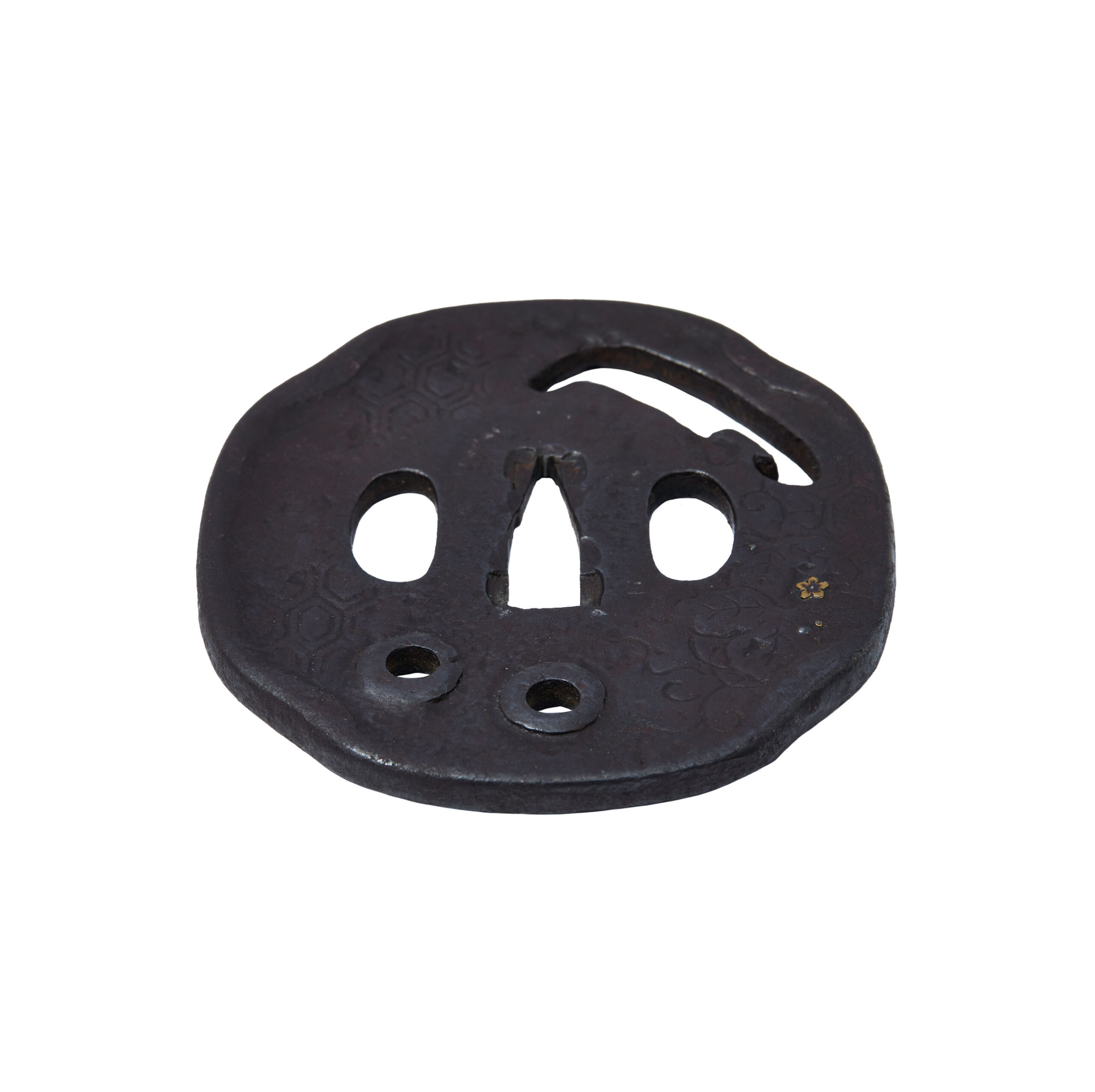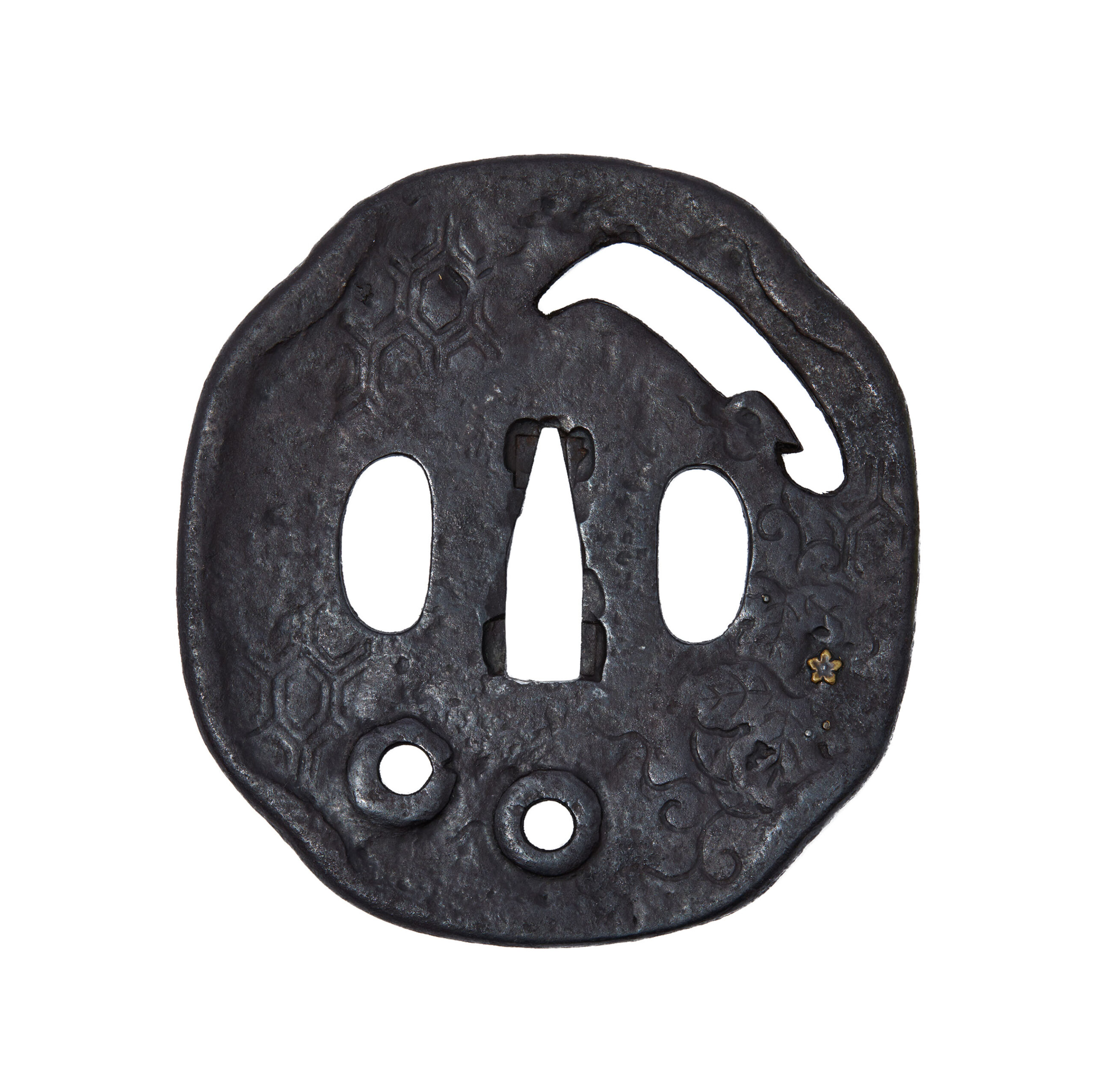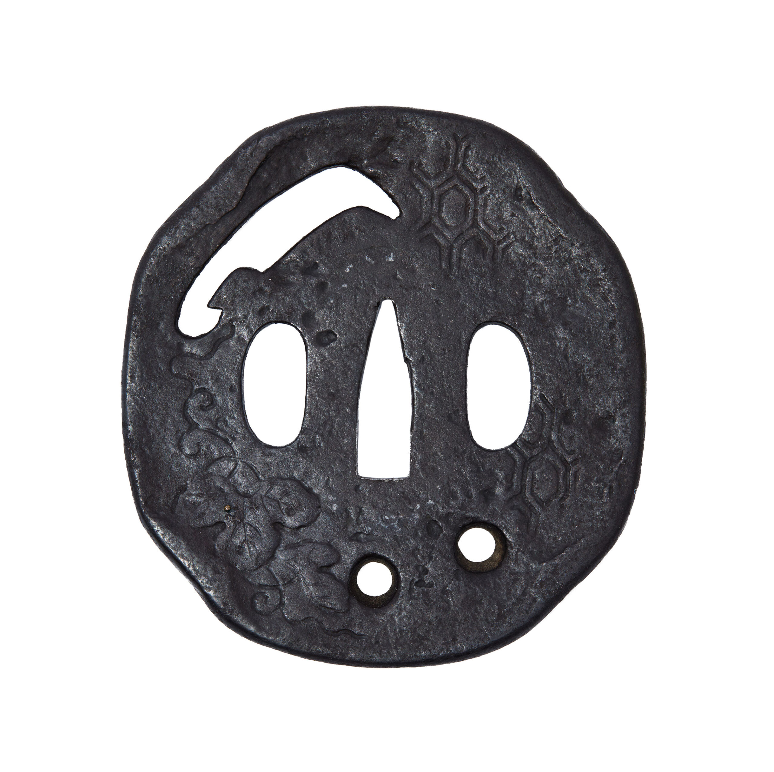 This tsuba also incorporates a tortoiseshell pattern (亀甲紋, kikkō-mon) engraved across its surface. The kikkō motif, composed of repeating hexagonal forms inspired by a turtle’s shell, has long symbolized longevity, prosperity, and stability in Japanese culture. It was widely employed in armor and sword fittings as a protective design, expressing the wish for a warrior’s enduring success and well-being.