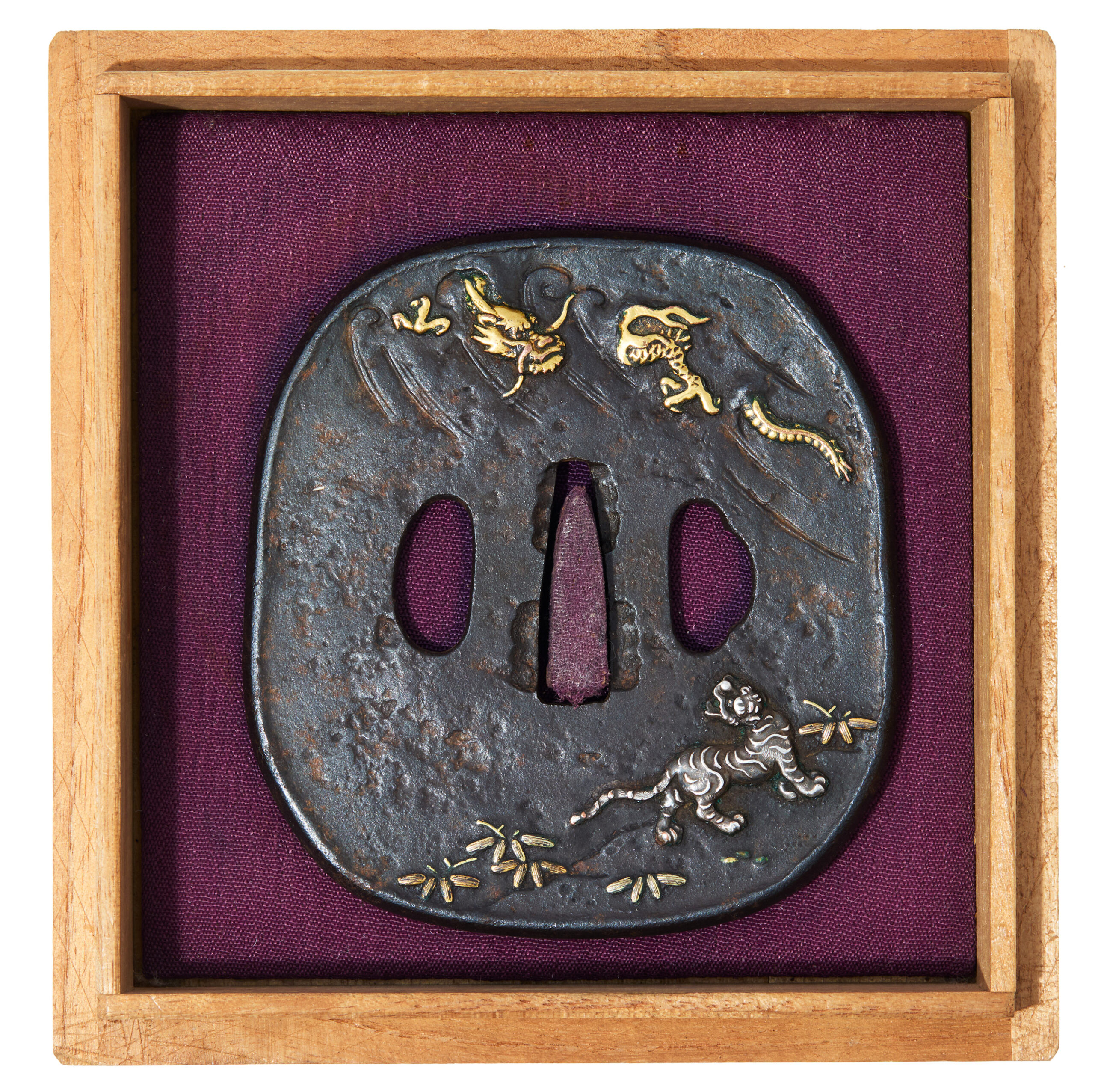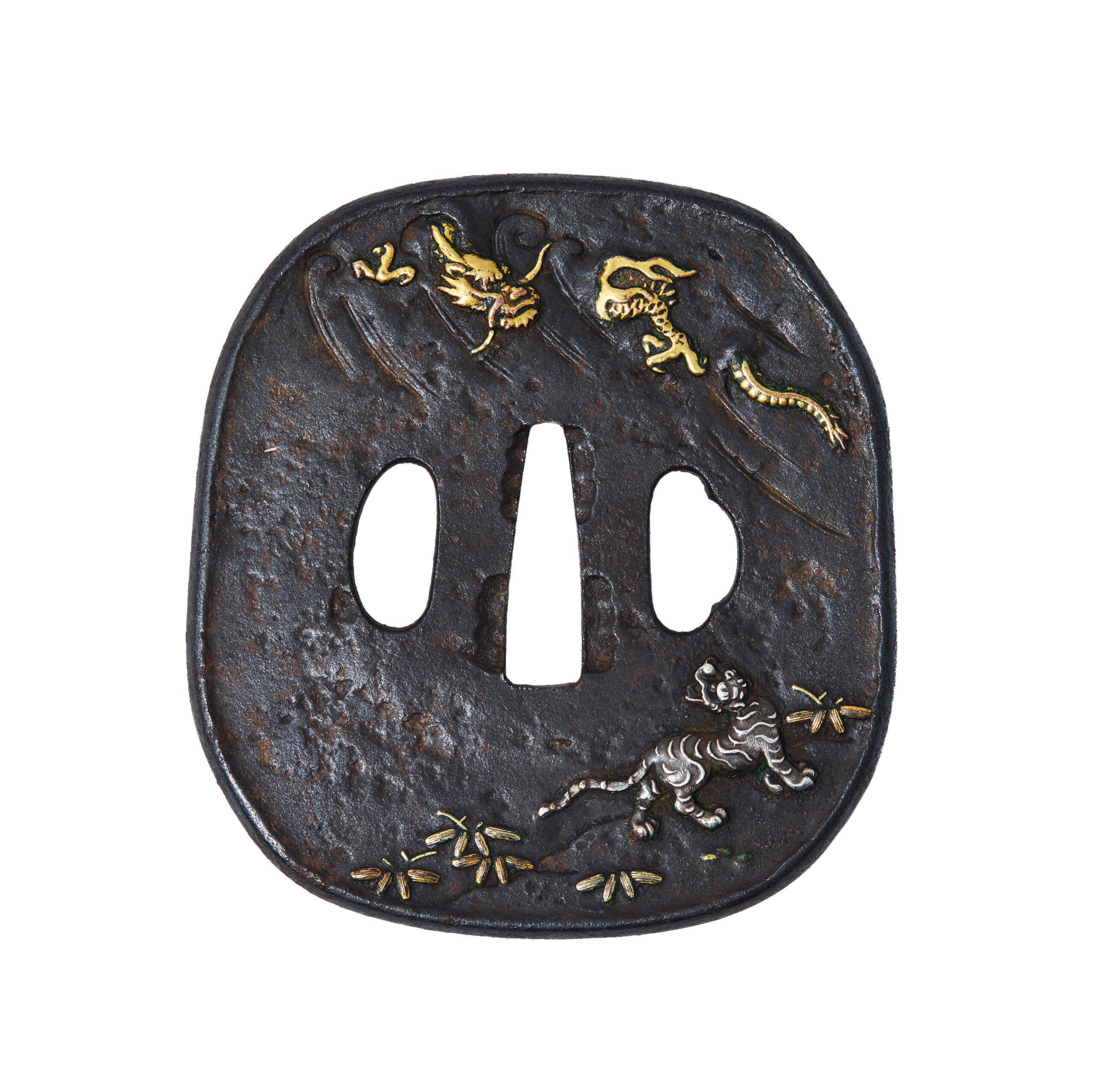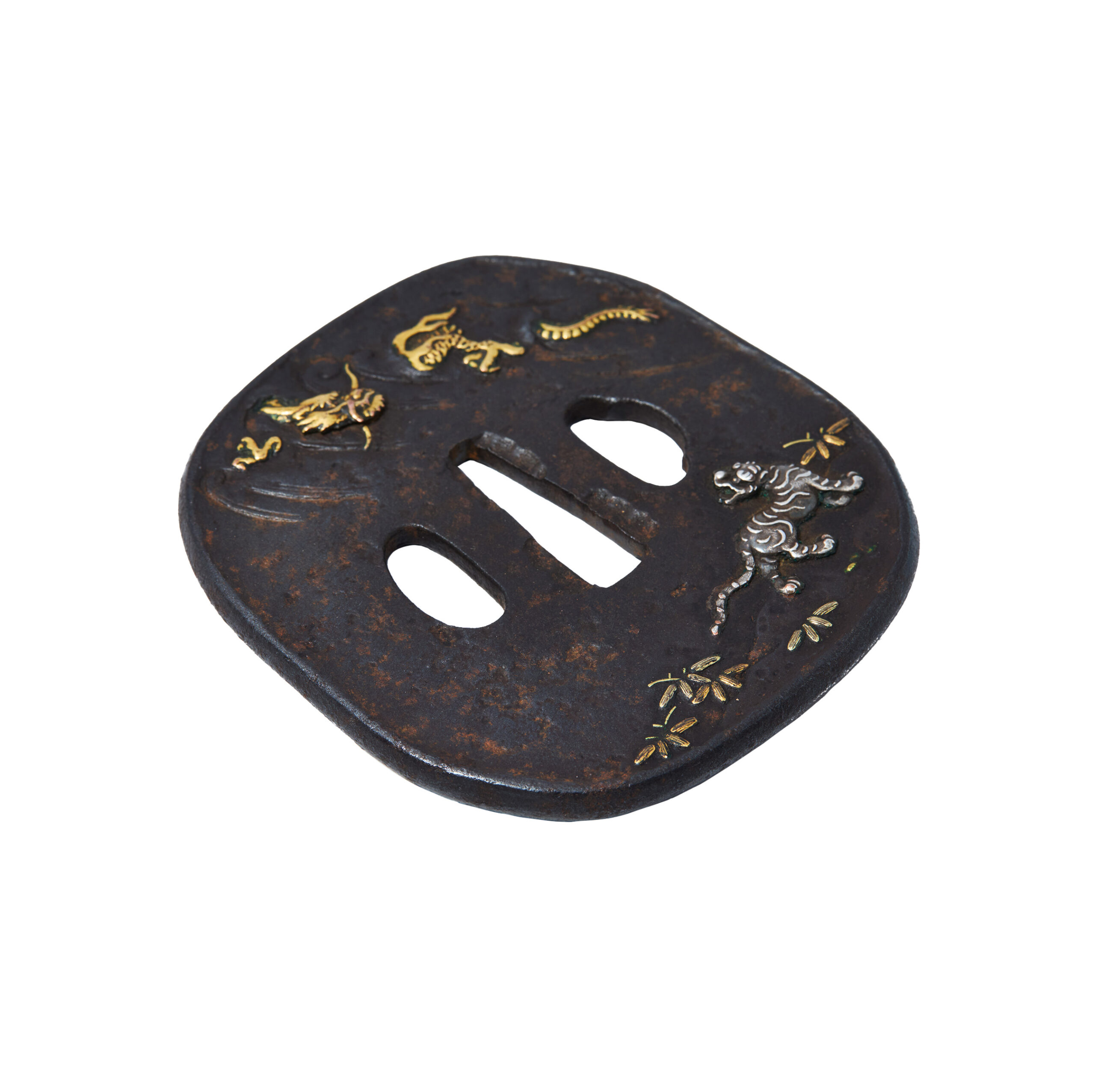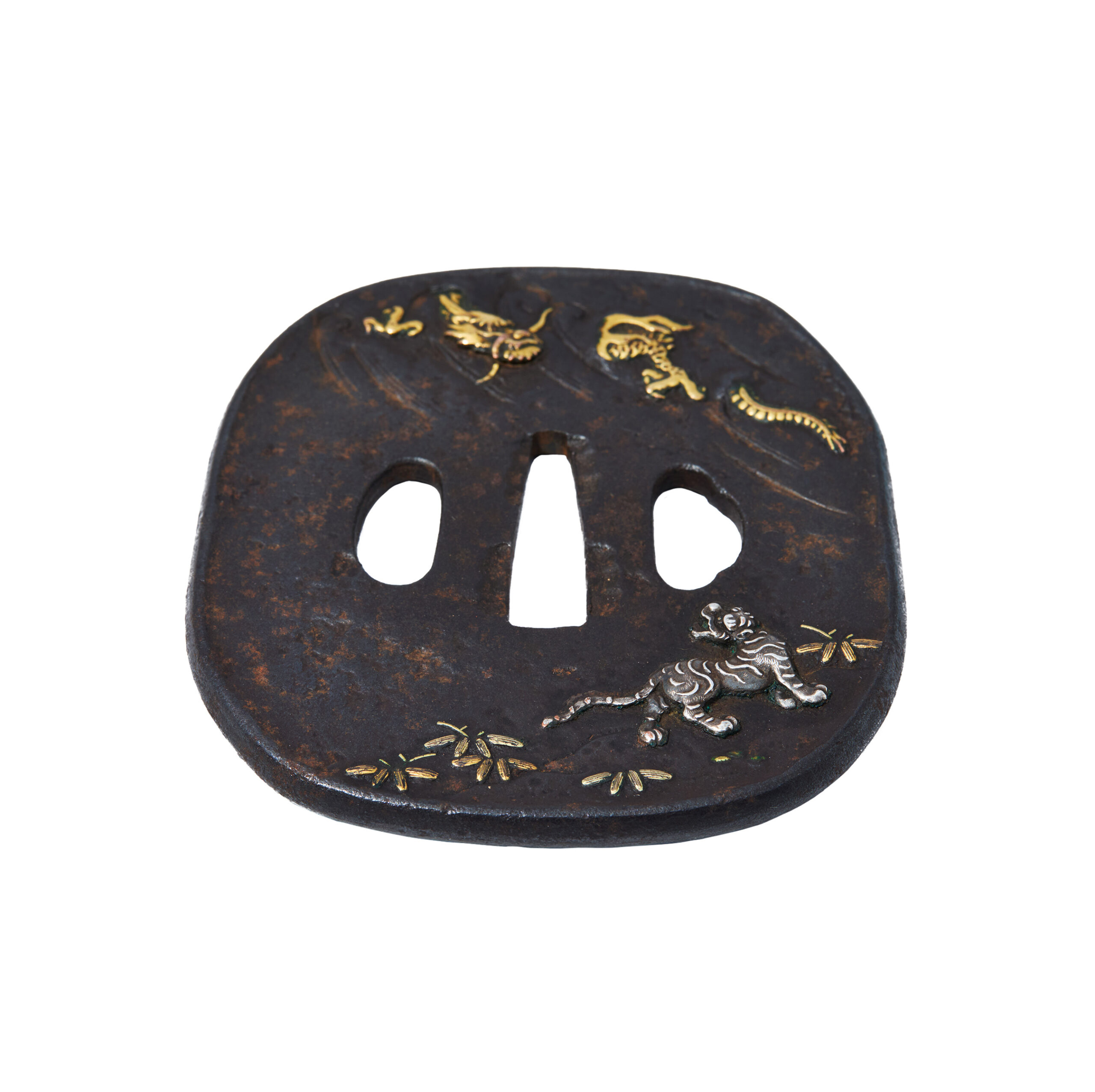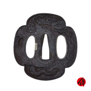 This Tsuba was made by Aizu Zeami (会津世阿弥) and is titled “Dragon and Tiger (龍虎図)”. The surface is executed in high-relief carving (高彫, takabori) and enhanced with metal inlay (象嵌, zōgan), showcasing intricate decorative motifs. Its combination of durable ironwork and refined ornamentation reflects both functional and aesthetic qualities characteristic of Japanese sword fittings.