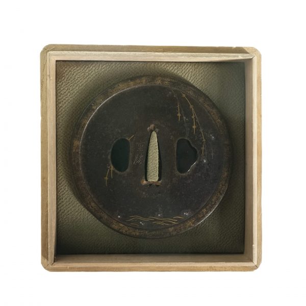 Circle-shaped Tsuba made from iron. The scene of Yudachi (夕立, evening shower) is designed. A kind of plant, which looks like weeping willows, is inlaid. Small silver drops represent raindrops. Mimi (耳, the edge of Tsuba) is finished thickly; this decorative Mimi is categorized Dote-Mimi (土手耳). The signature of this Tsuba’s maker is seen on the surface.