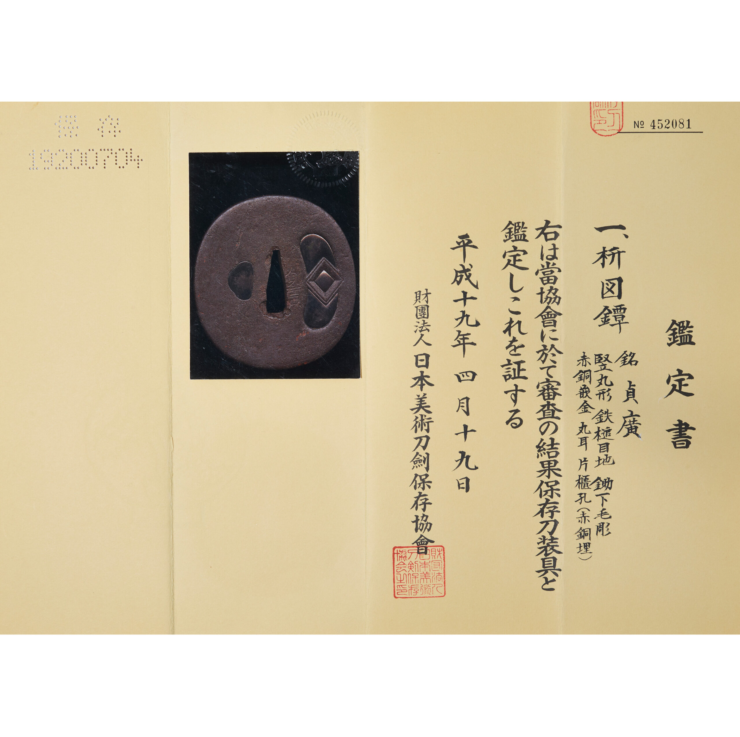 According to the authentication certificate, this piece was crafted and signed by Sadahiro (貞廣), a sword guard maker active in Owari Province (present-day Aichi Prefecture) during the mid-Edo period.