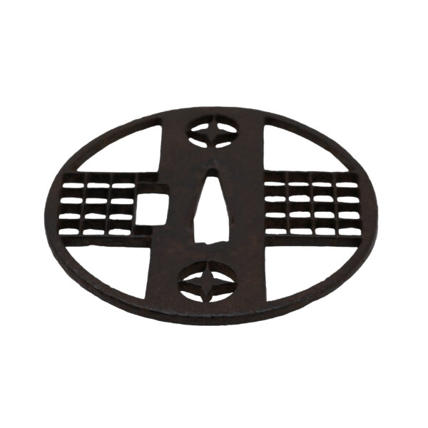 This Tsuba is recognized by The Society for Preservation of Japanese Art Swords, which is known as NBTHK. This Tsuba is categorized as the Heianjo (平安城) Tsuba. The Heianjo-style was established in Yamashiro (山城, today’s Kyoto Prefecture). According to a theory, this school was born during the reign of the sixth Shogun (将軍, general) of the Muromachi (室町) Shogunate. And its style was influenced by the tastes of the Shogun. The works of this school could be classified into two types according to their noticeable characteristics. The one is the Heanjo Sukashi Tsuba (平安城透鐔): the Kyou Sukashi Tsuba (京透鐔). Most Tsubas have circle shapes, and motifs are engraved dynamically with openwork. The refined composition and outstanding techniques give the impression that metalworkers attached importance to the beauty of openwork more than the practicality of a Tsuba itself. Another type is the Heanjo Zougan Tsuba (平安城象嵌鐔), which is also called the Heianjo Shinchu Zougan Tsuba (平安城真鍮象嵌鐔). Shinchu (真鍮) means brass, and Zougan (象嵌) means inlay in Japanese. This style inherited Ounin Tsuba’s (応仁鐔) techniques. Motifs such as Botan (牡丹, peony), Nanten (南天, nandina), or Karakusa (唐草, arabesque) patterns are inlaid with brass on circle-shaped iron Tsubas. Later, artisans started using gold, silver, and Shakudou (赤銅, an alloy of copper and gold) to create more ornate Tsuba works. This Tsuba is a type of the Heianjo Sukashi Tsuba, which is also known as the Kyo Sukashi Tsuba as mentioned above.