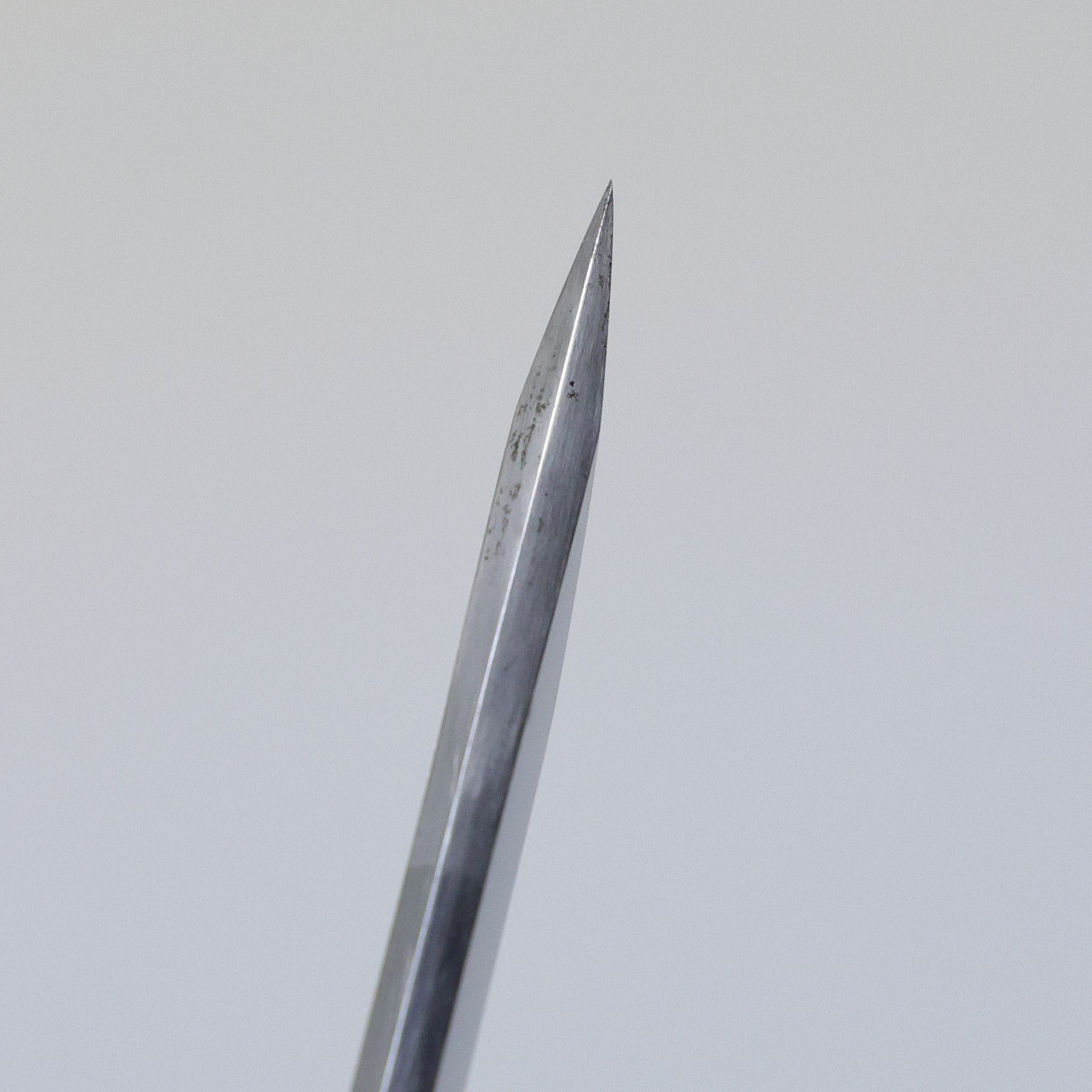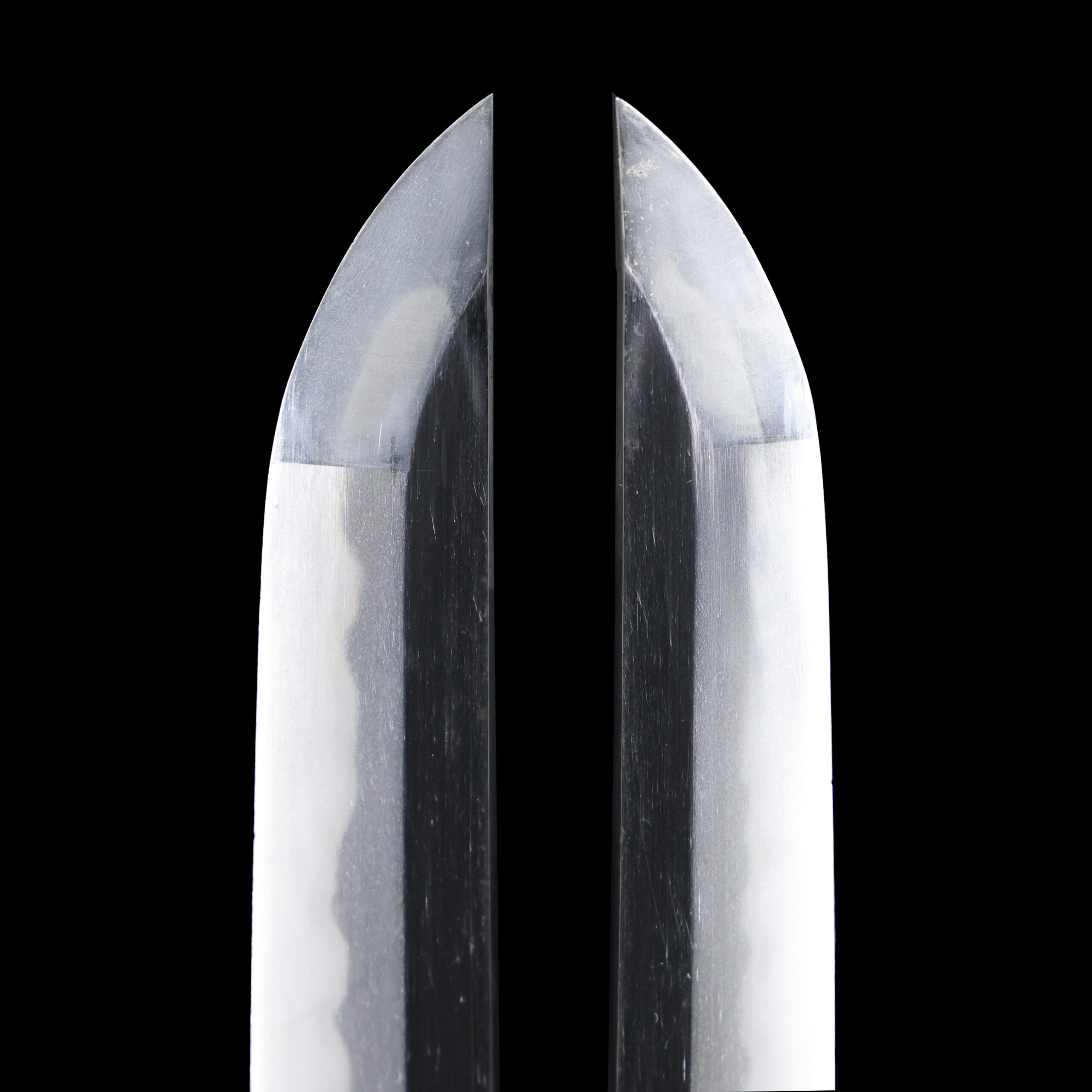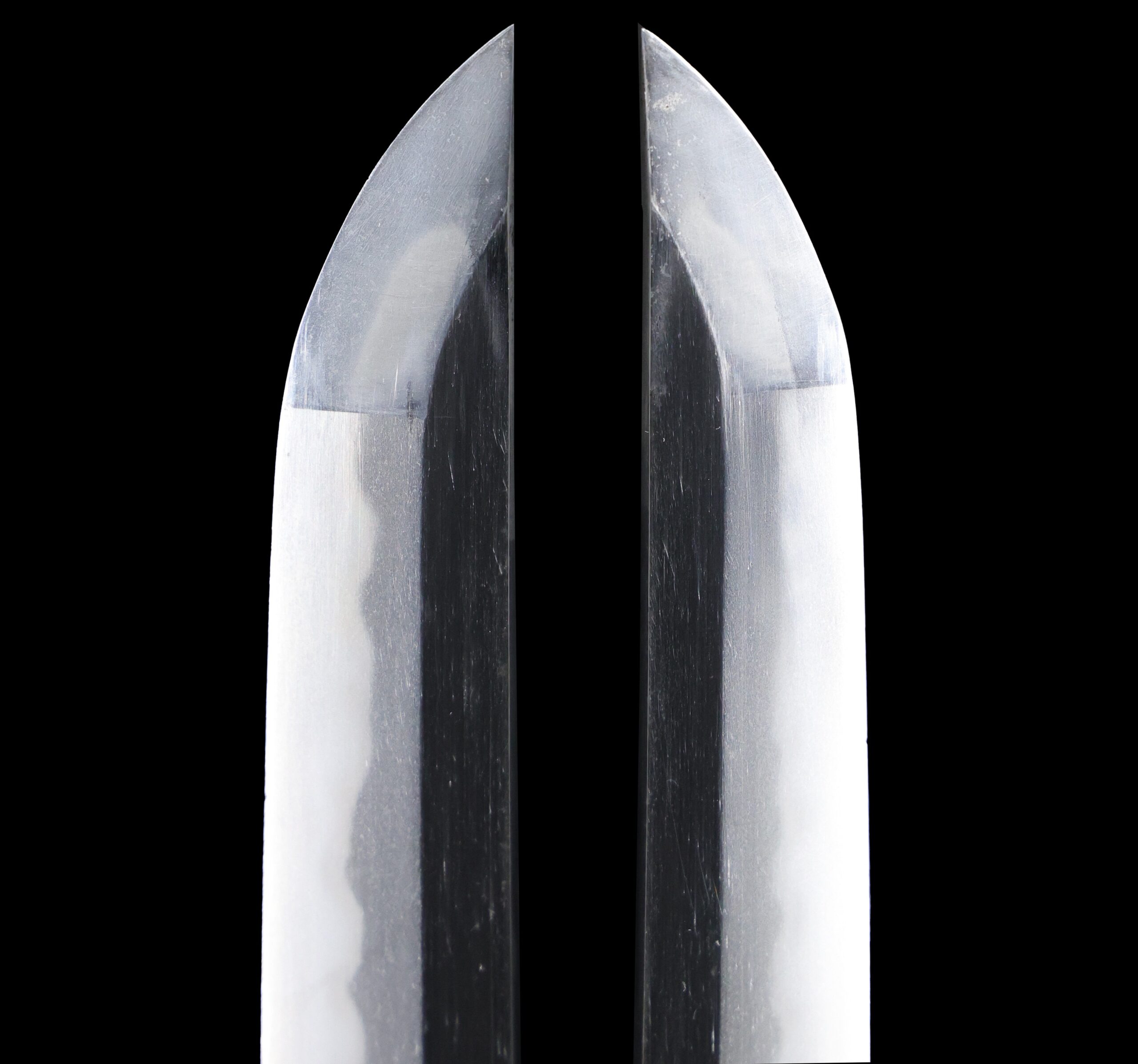 The kissaki of a Japanese sword varies by size and shape. Main types include ōkissaki (very large), chūkissaki (moderately large), kokissaki (smallest), kamasu-kissaki (tapered like a barracuda’s mouth), and ikubi-kissaki (short and stout like a boar’s neck). This sword has an ōkissaki, making its tip exceptionally large.