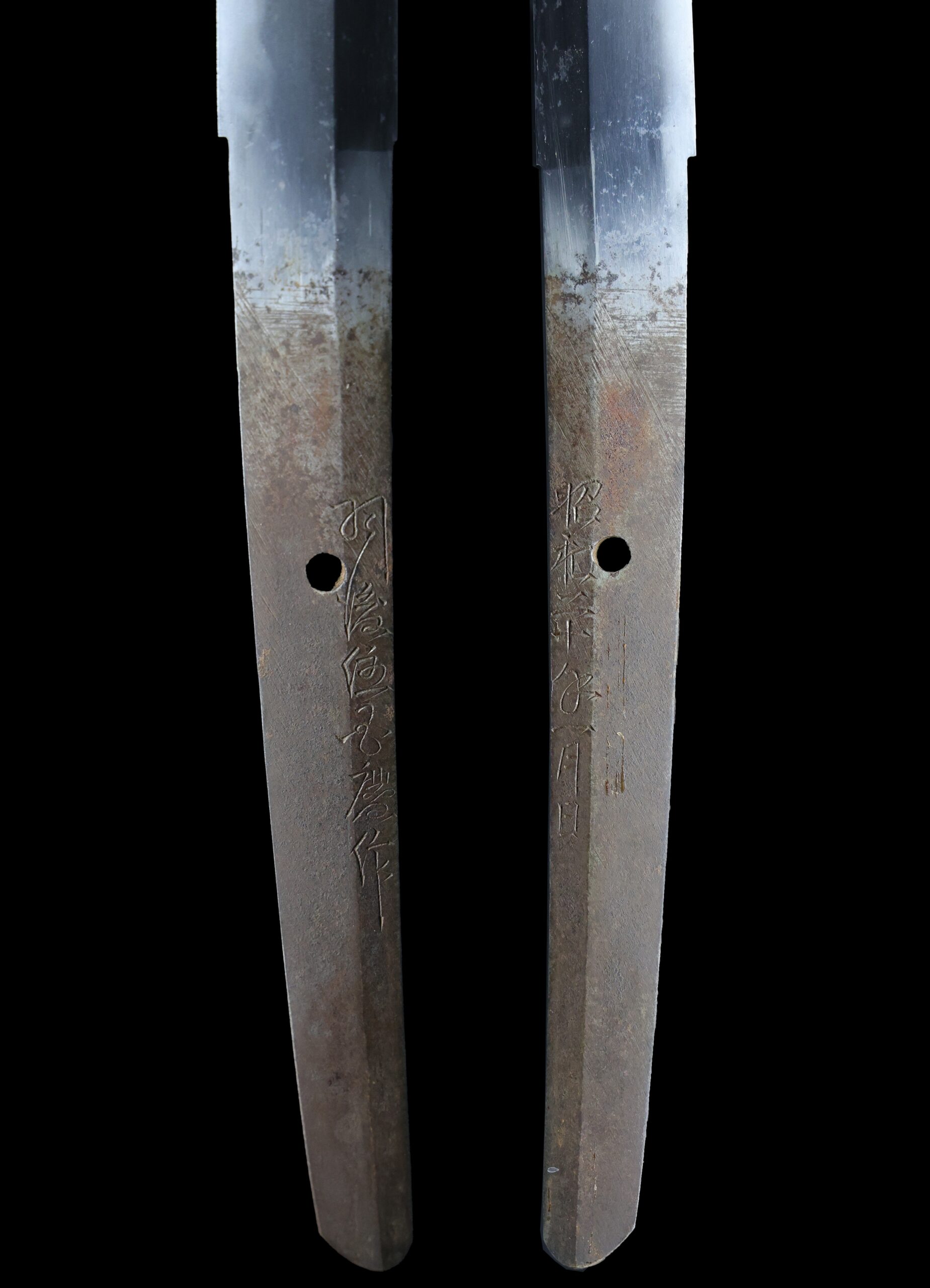 Japanese swordsmiths left the black rust on the tang on purpose to prevent red rust while the tang is in its handle. And the discoloration of the tang was created over time, which is a great indicator for a Japanese sword specialist to estimate when the sword was forged.
