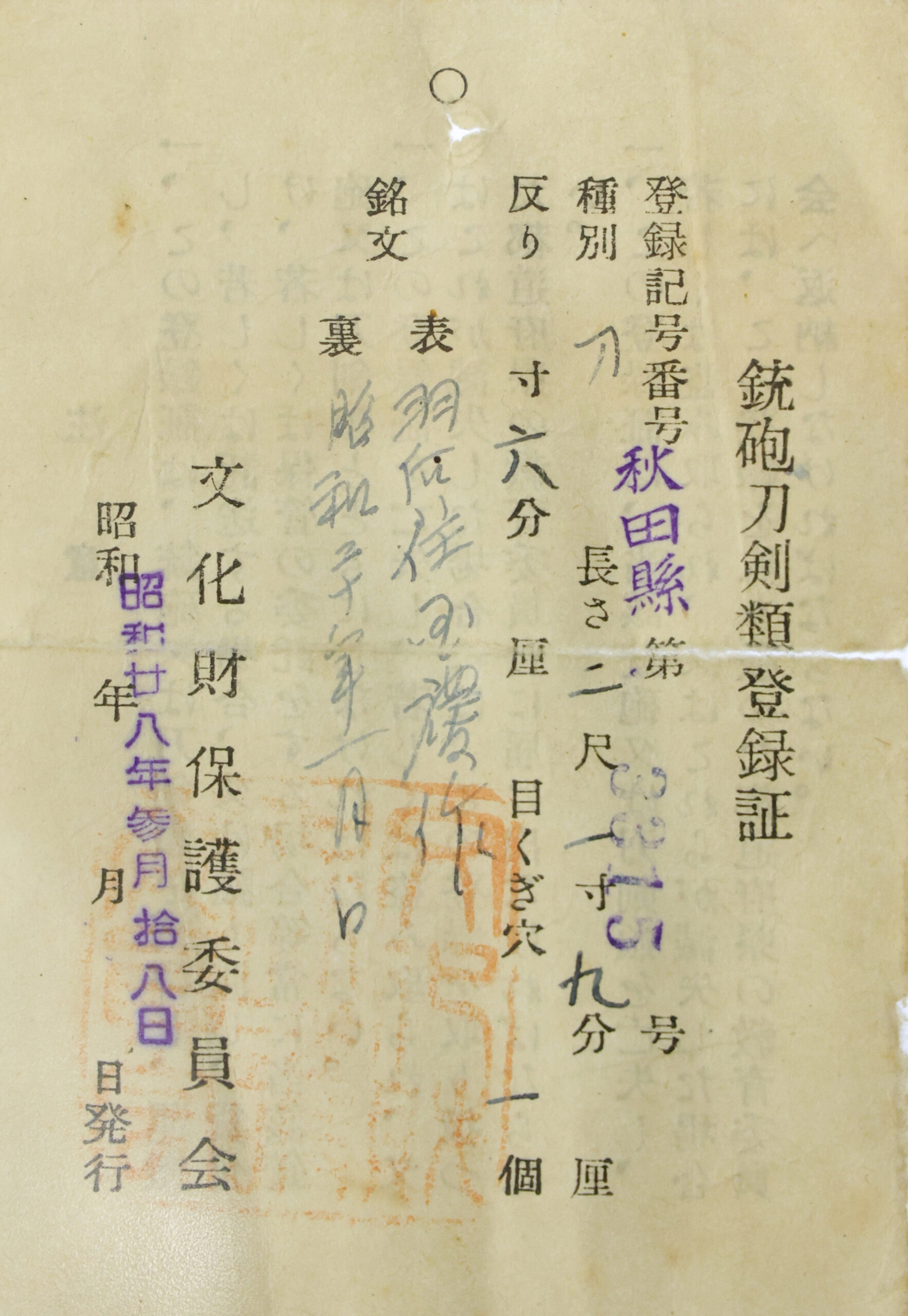 The Board of Education in Akita prefecture issued a registration paper for the Katana. It is called Jyu Hou Touken Rui Torokusho (銃砲刀剣類登録証). Bunkacho (The Agency for Cultural Affairs) acknowledges a Japanese sword with this paper as a work of art.