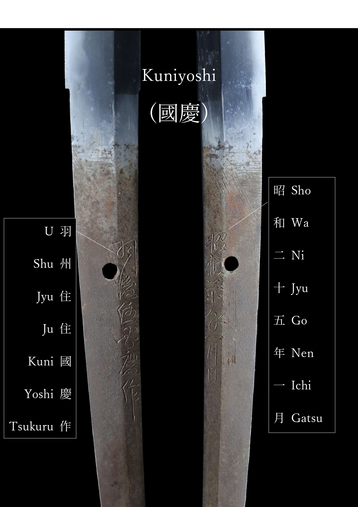 During World War II, Kuniyoshi was officially appointed as a Rikugun Jumei Tōshō (Army-Approved Swordsmith). In the Shōdai Tōshō Iretsu-hyō (ranking list of Shōwa-era swordsmiths), he was placed in the upper tier of Jōkō, and his blades were rated as Ryō-Ōwazamono (excellent cutting ability), earning him the prestigious Ōzeki rank.